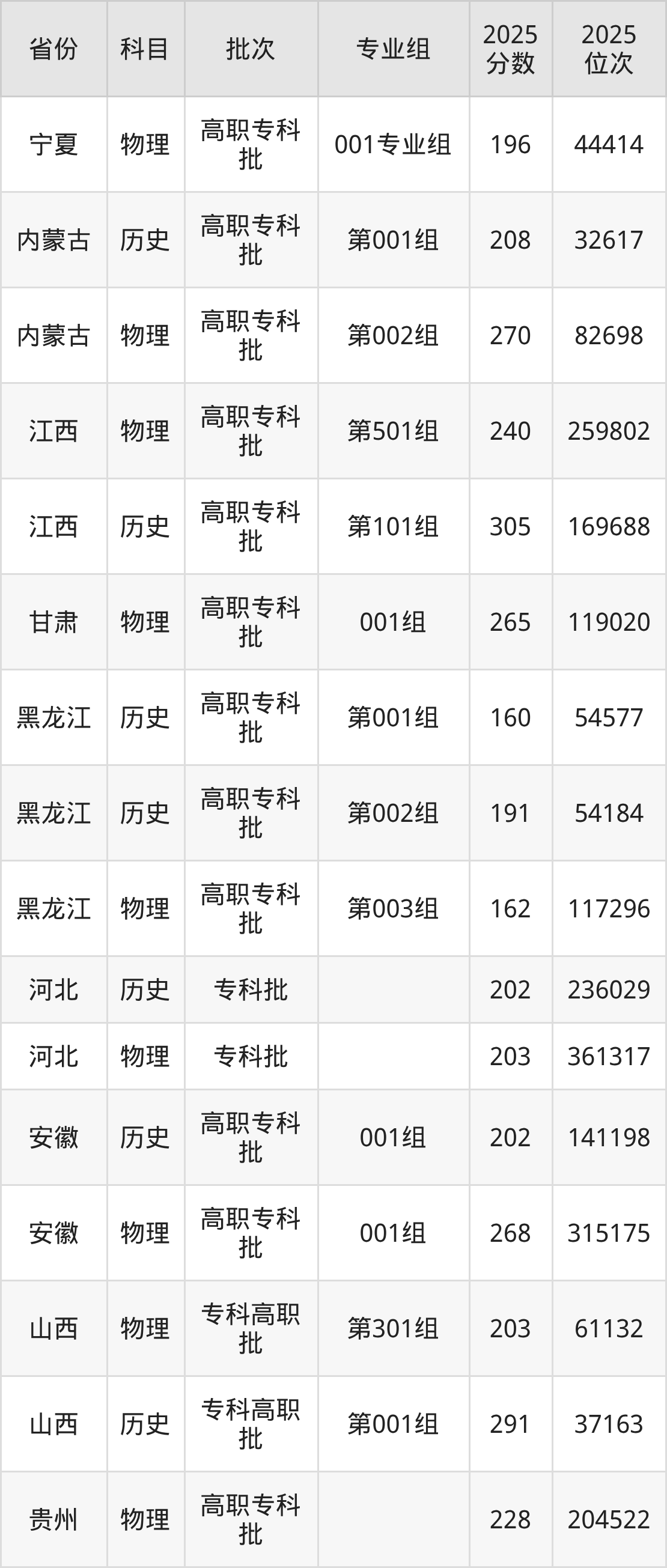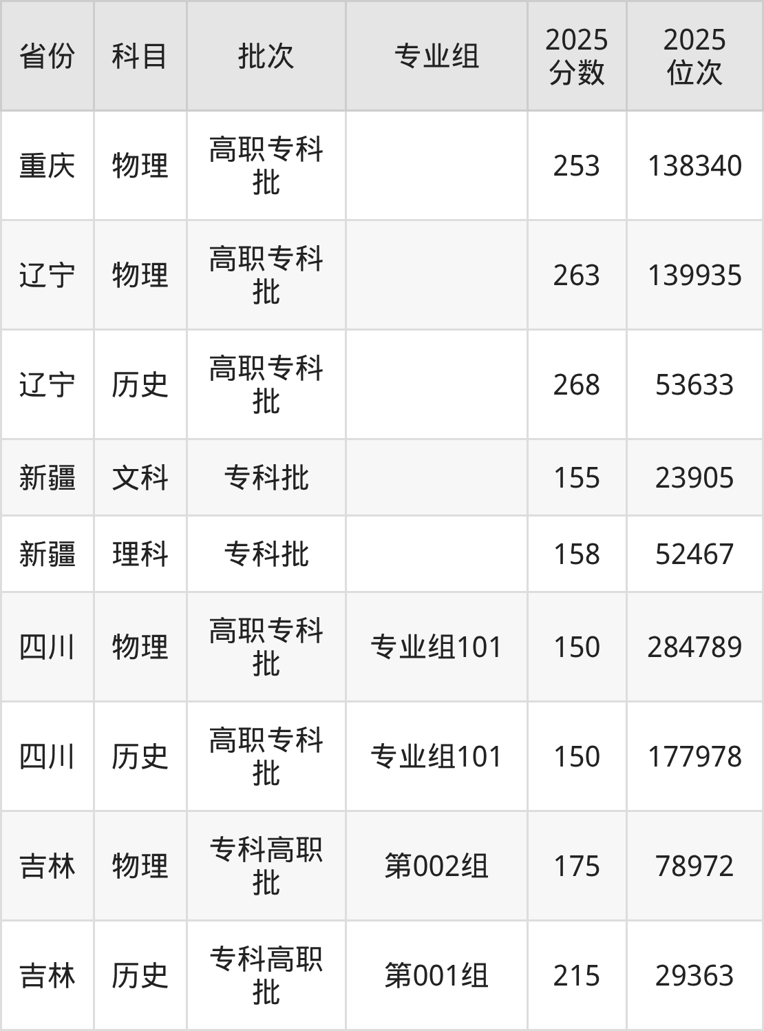 2025年在专科物理类进行招生,各专业组分数线详情如下: