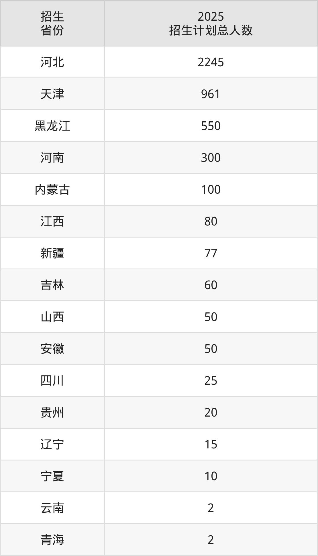 2025年天津滨海汽车工程职业学院面向全国19个省市开展专科招生;招生专业共22个,招生人数共4553人。2025年在天津市招生计划总人数是961人,其中,天津滨海汽车工程职业学院在天津市招生人数最多的是人工智能技术应用。天津滨海汽车工程职业学院在各省具体招生人数情况如下表。