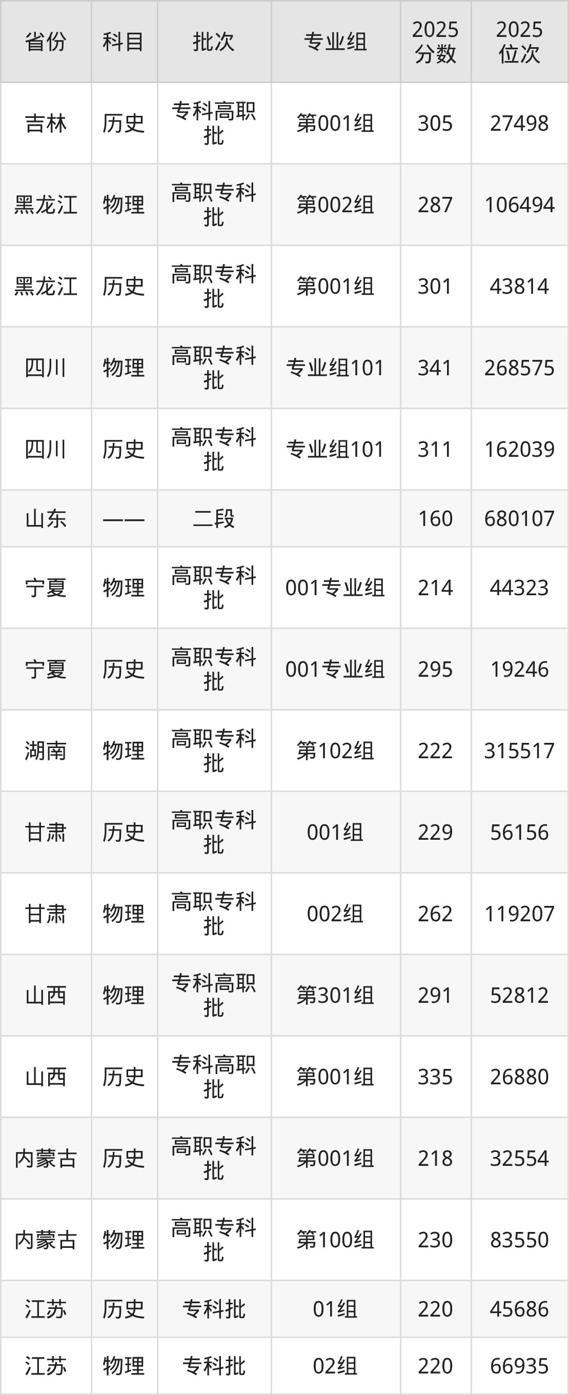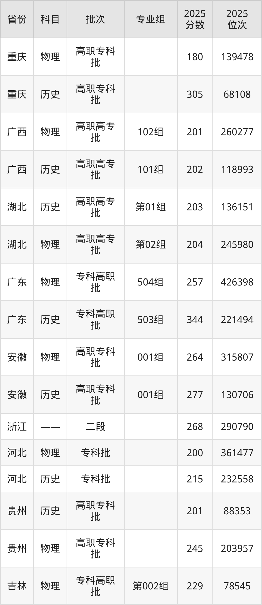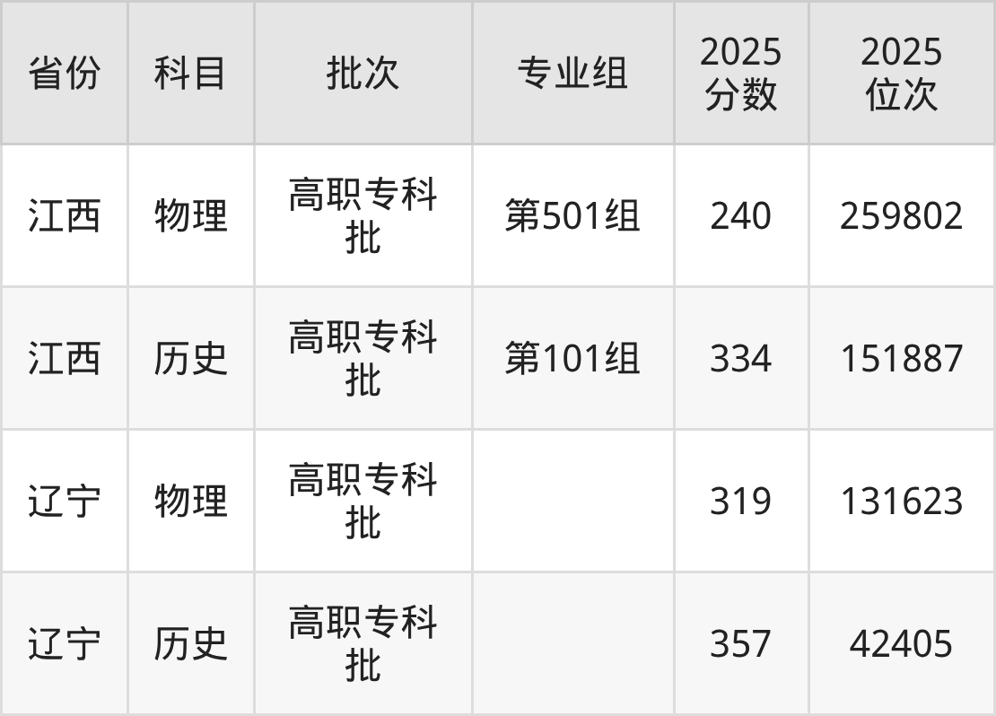 2025年在专科物理类进行招生,各专业组分数线详情如下: