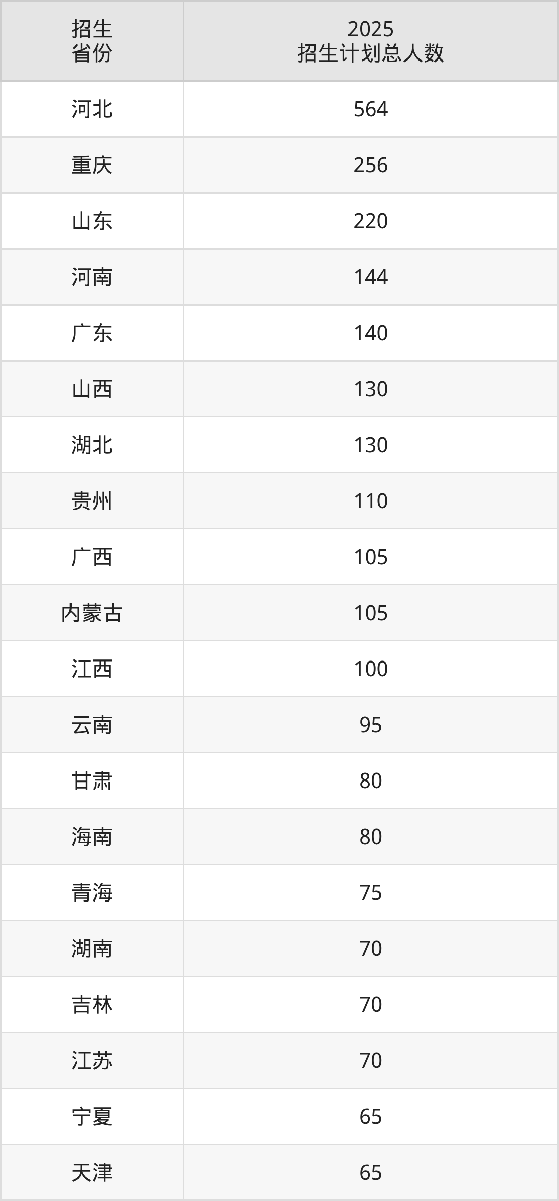 2025年四川西南航空职业学院面向全国26个省市开展专科招生;招生专业共33个,招生人数共2938人。2025年在四川省招生计划总人数是8人,其中,四川西南航空职业学院在四川省招生人数最多的是空中乘务。四川西南航空职业学院在各省具体招生人数情况如下表。