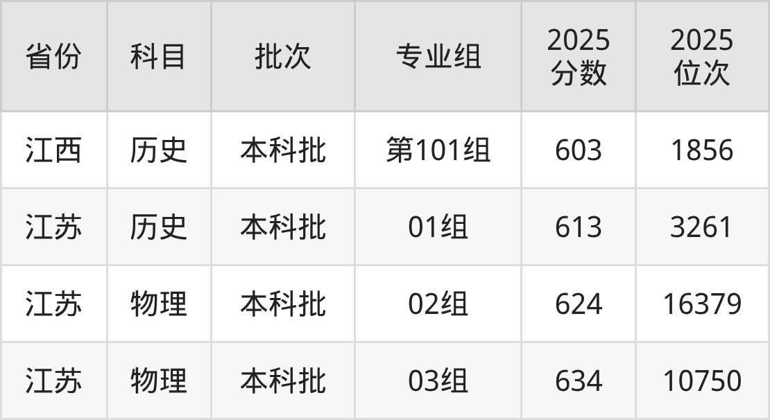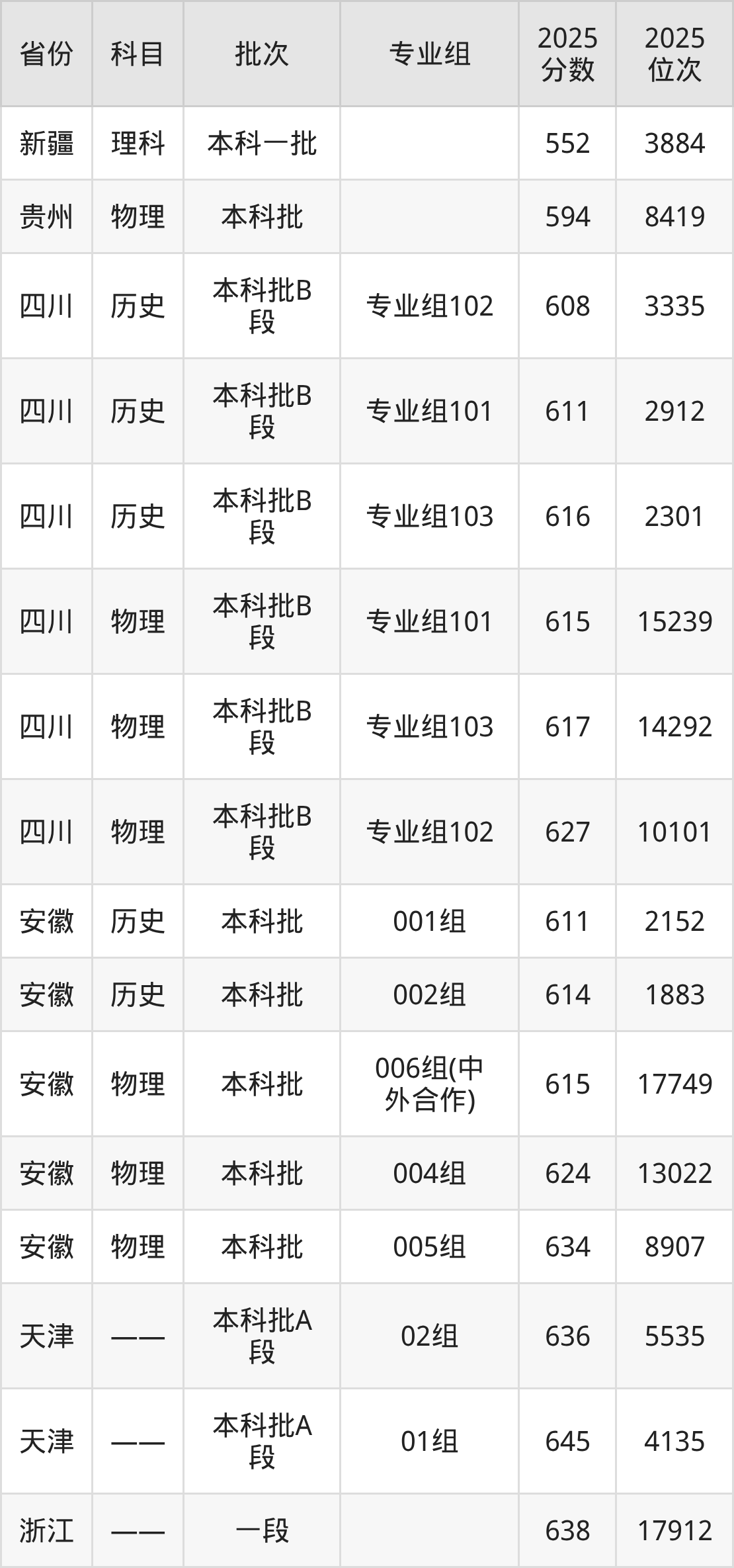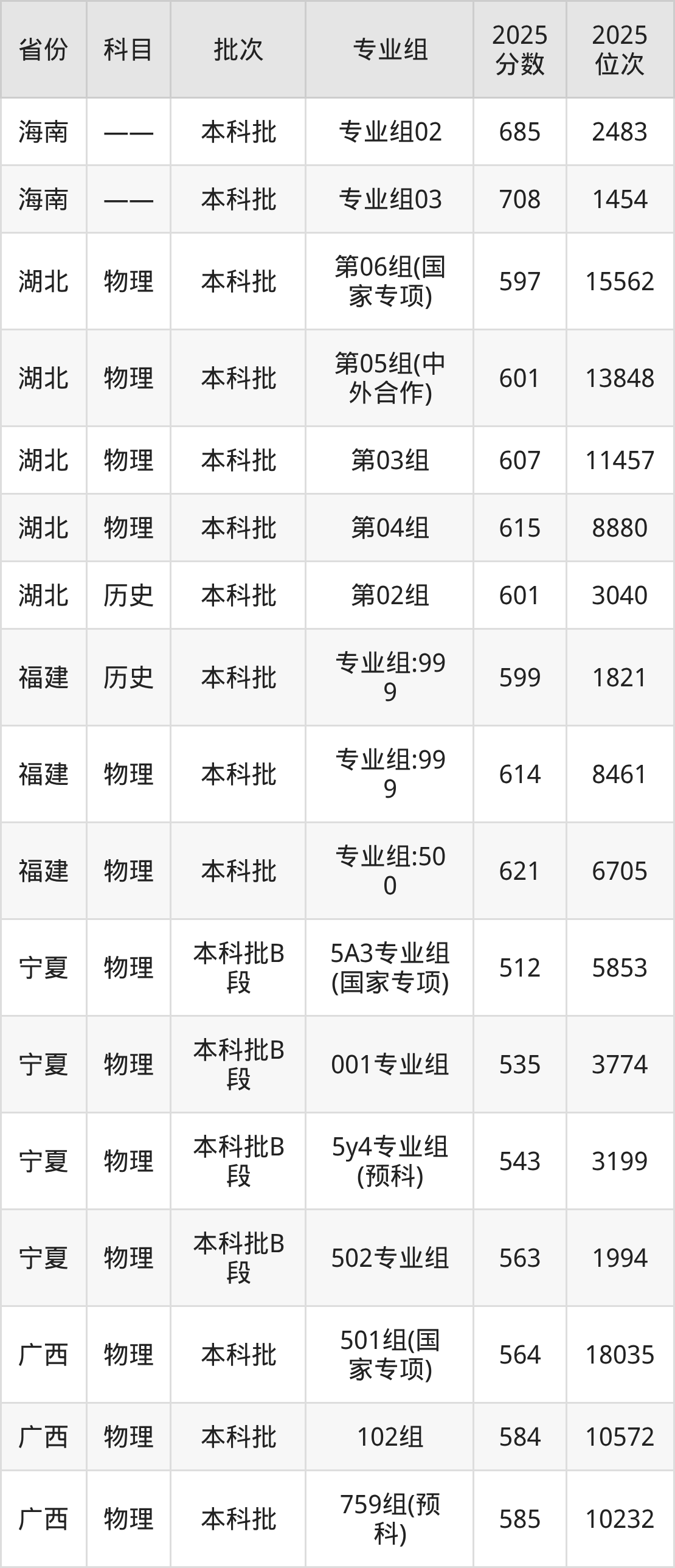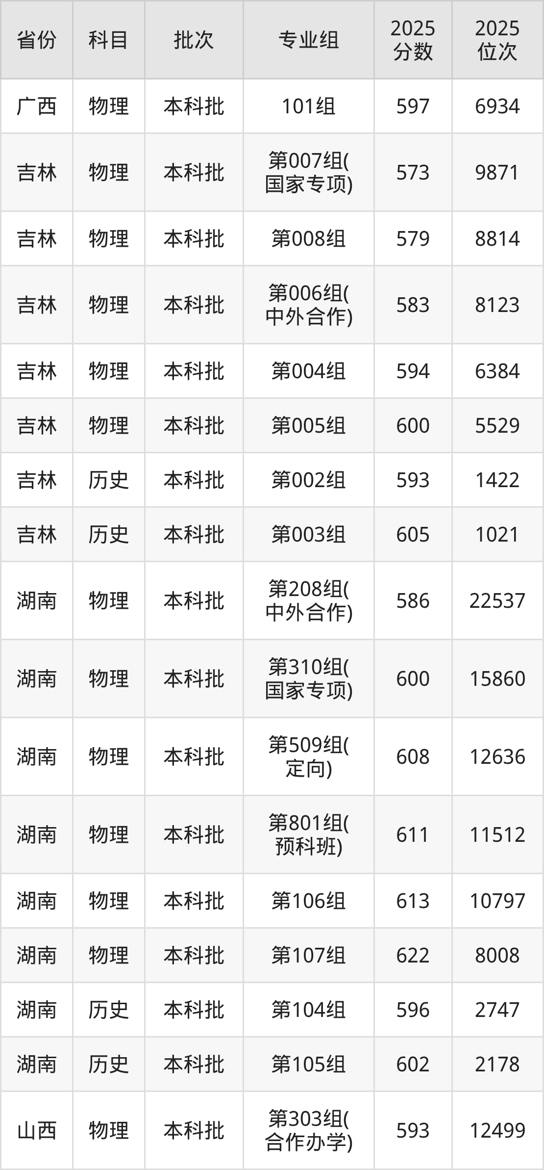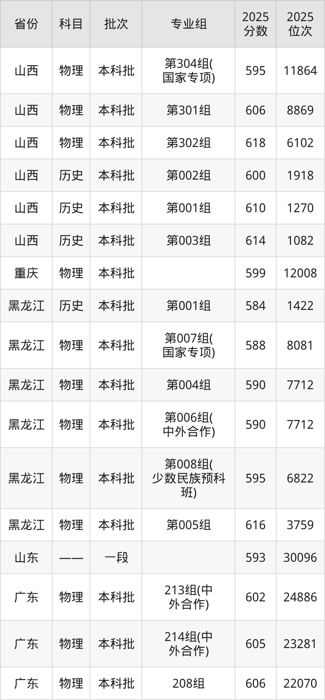 2025年在本科物理类进行招生,各专业组分数线详情如下: