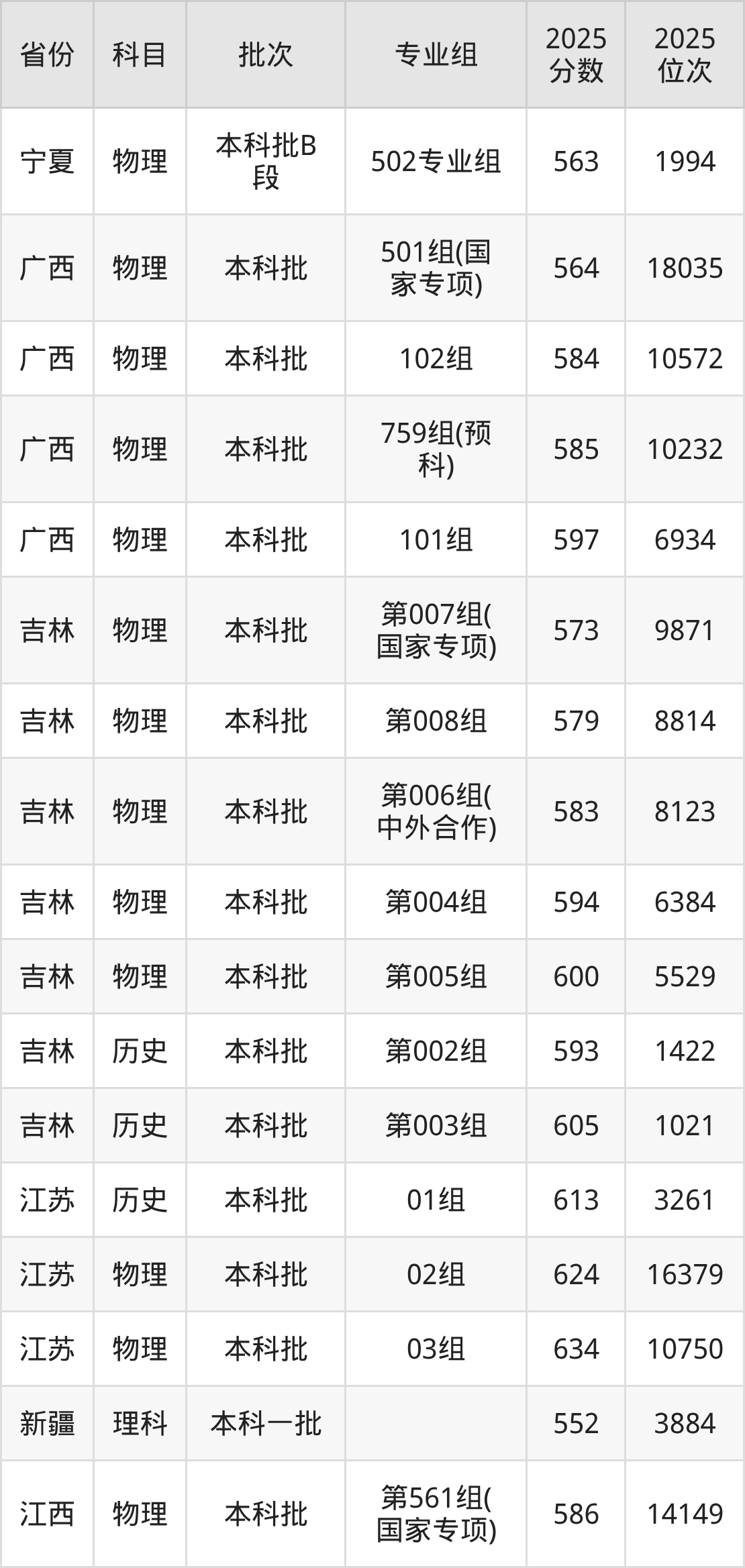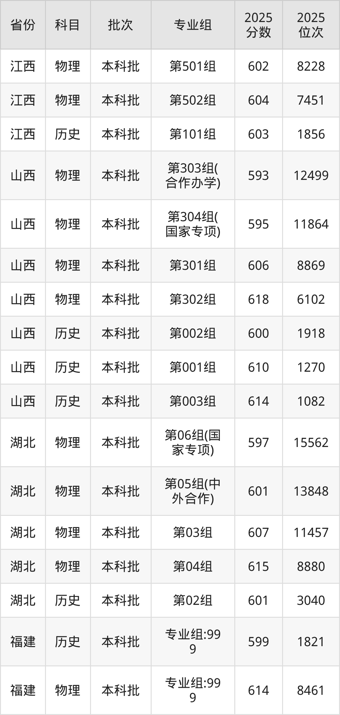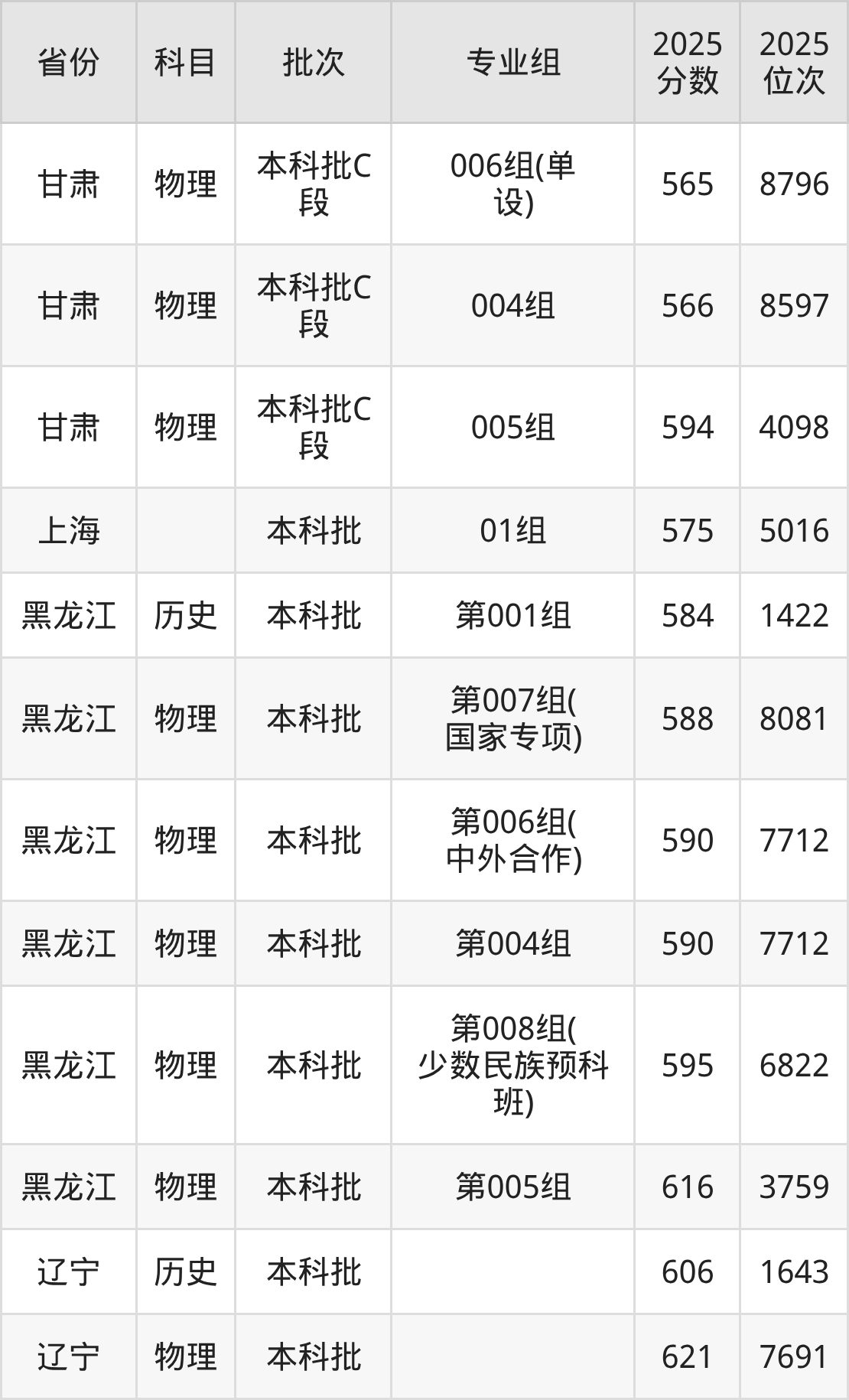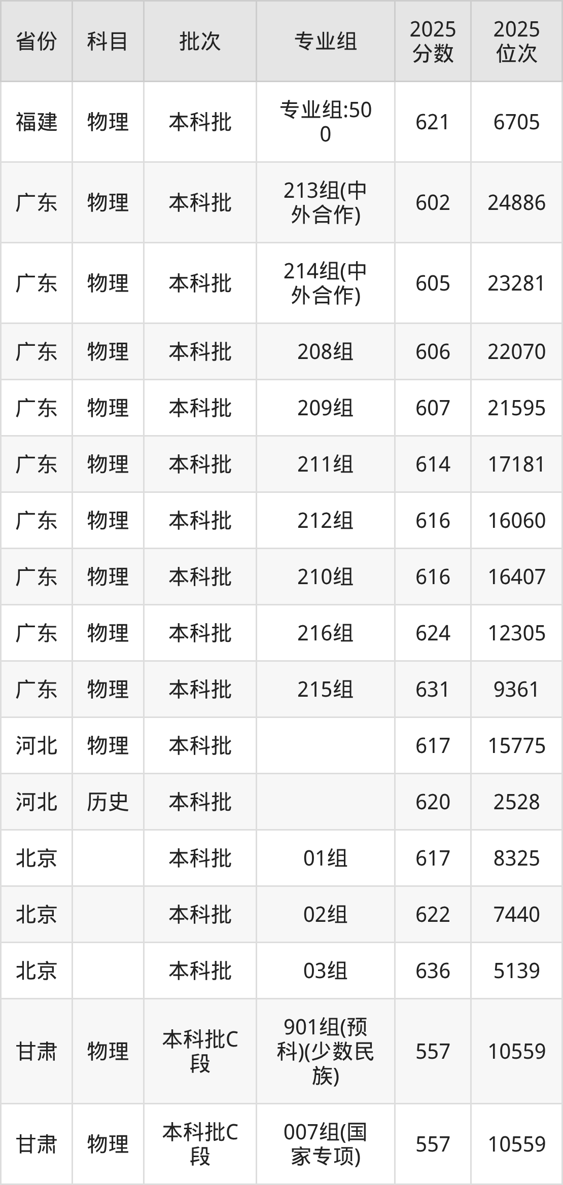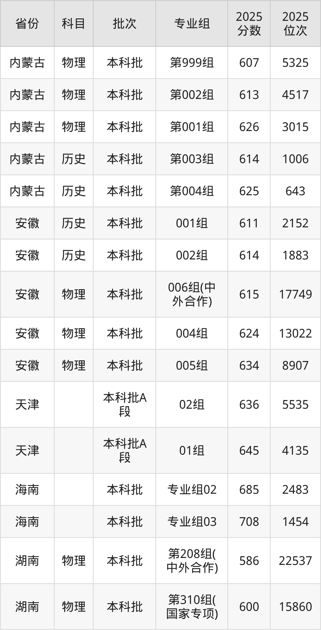 2025年在本科物理类进行招生,各专业组分数线详情如下: