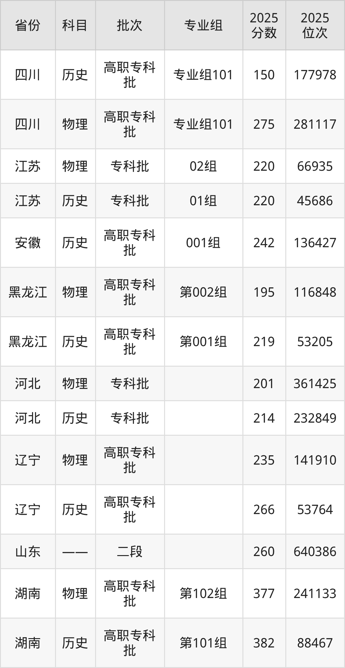 2025年唐山海运职业学院全国录取分数线是150分到382分,录取最低在四川历史类(专业组101)、录取最高在湖南历史类(第101组)。各省各专业组最低分具有差异,详情如下: