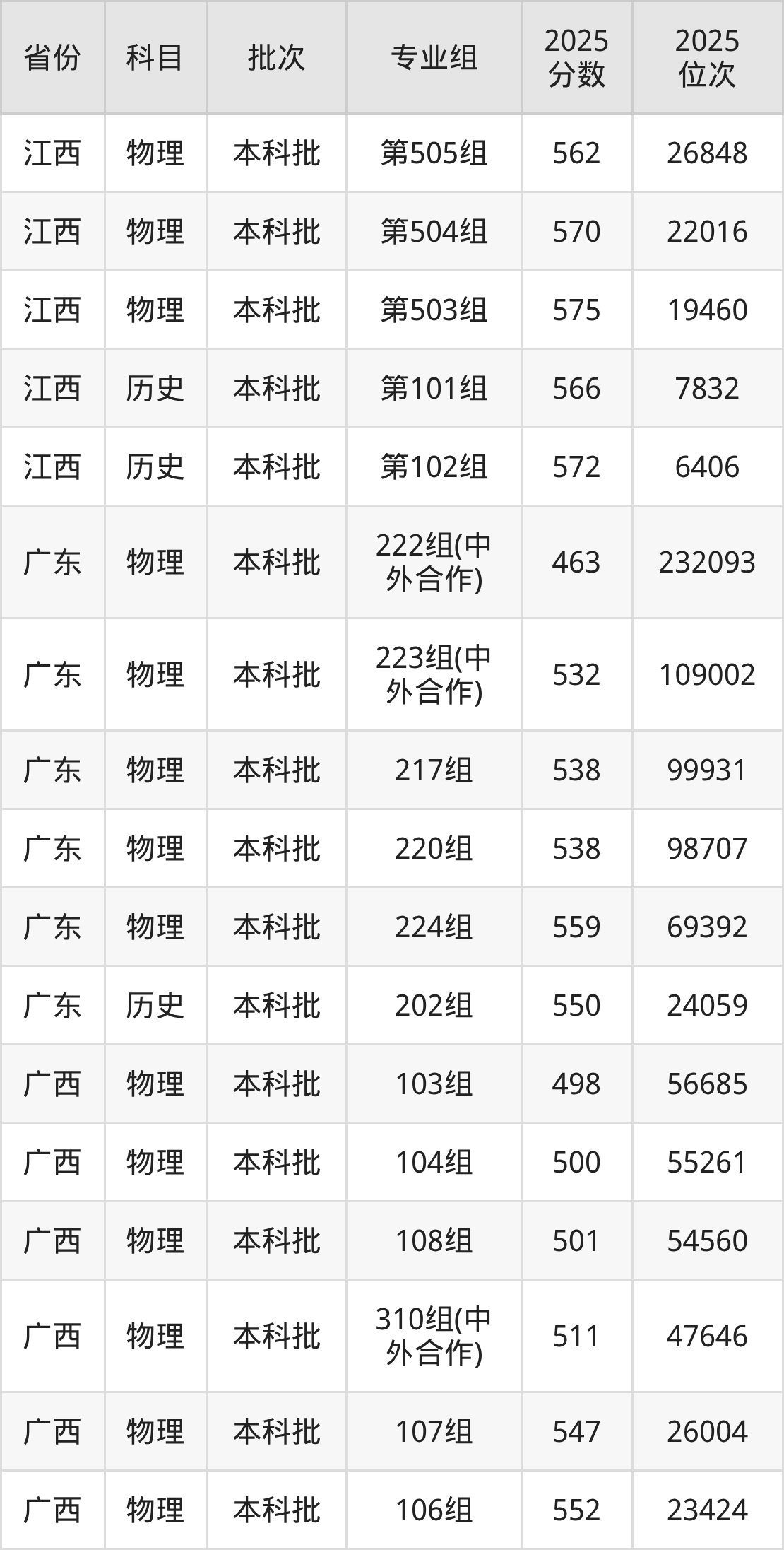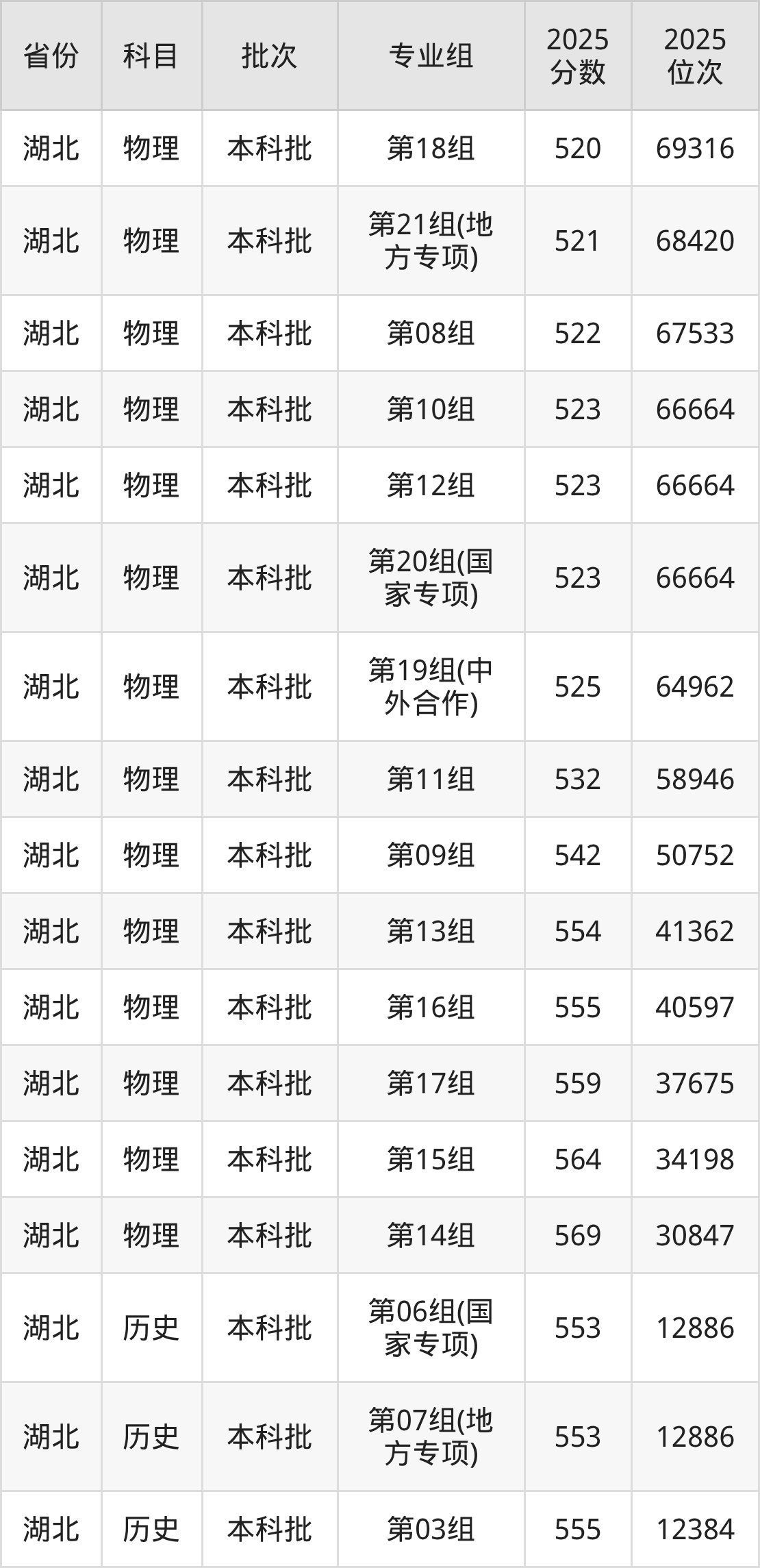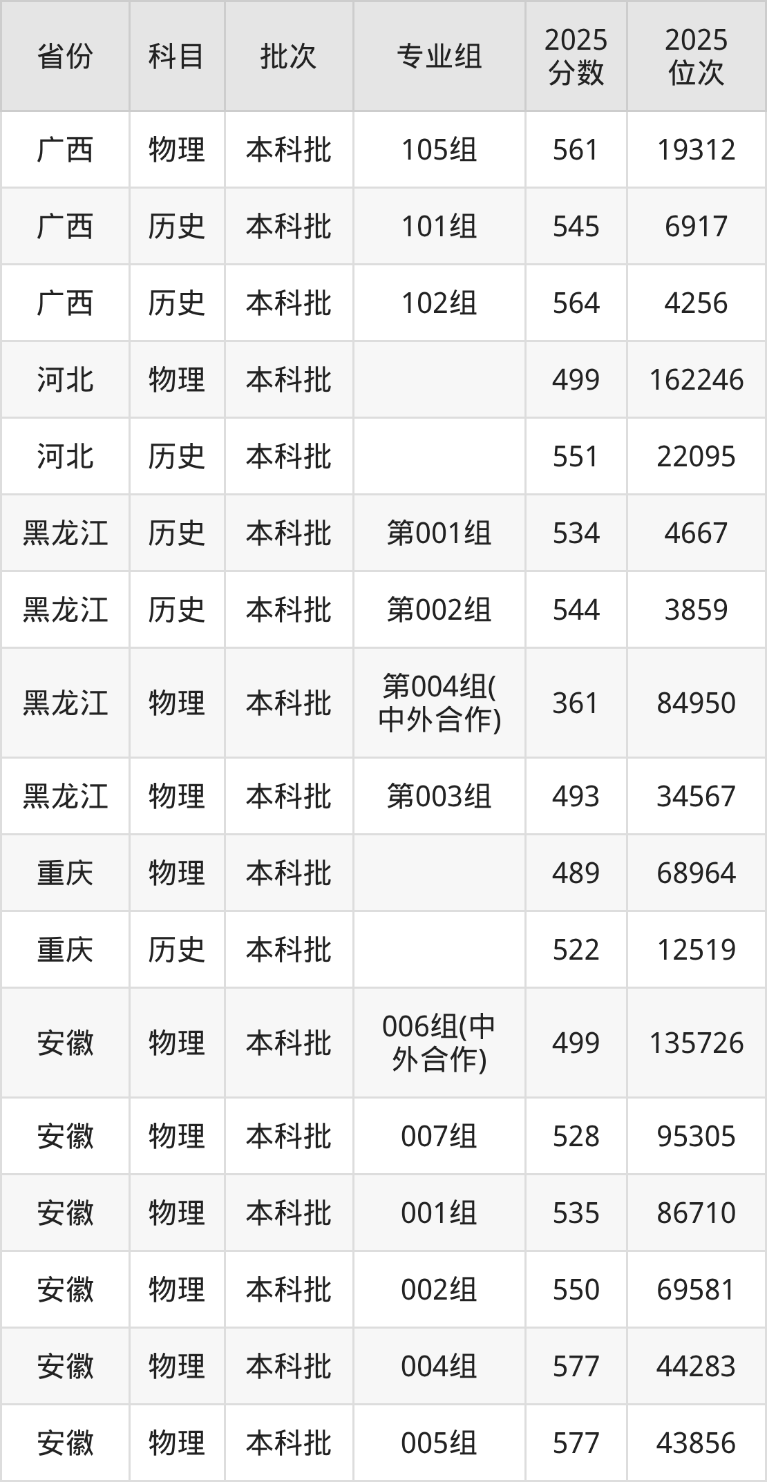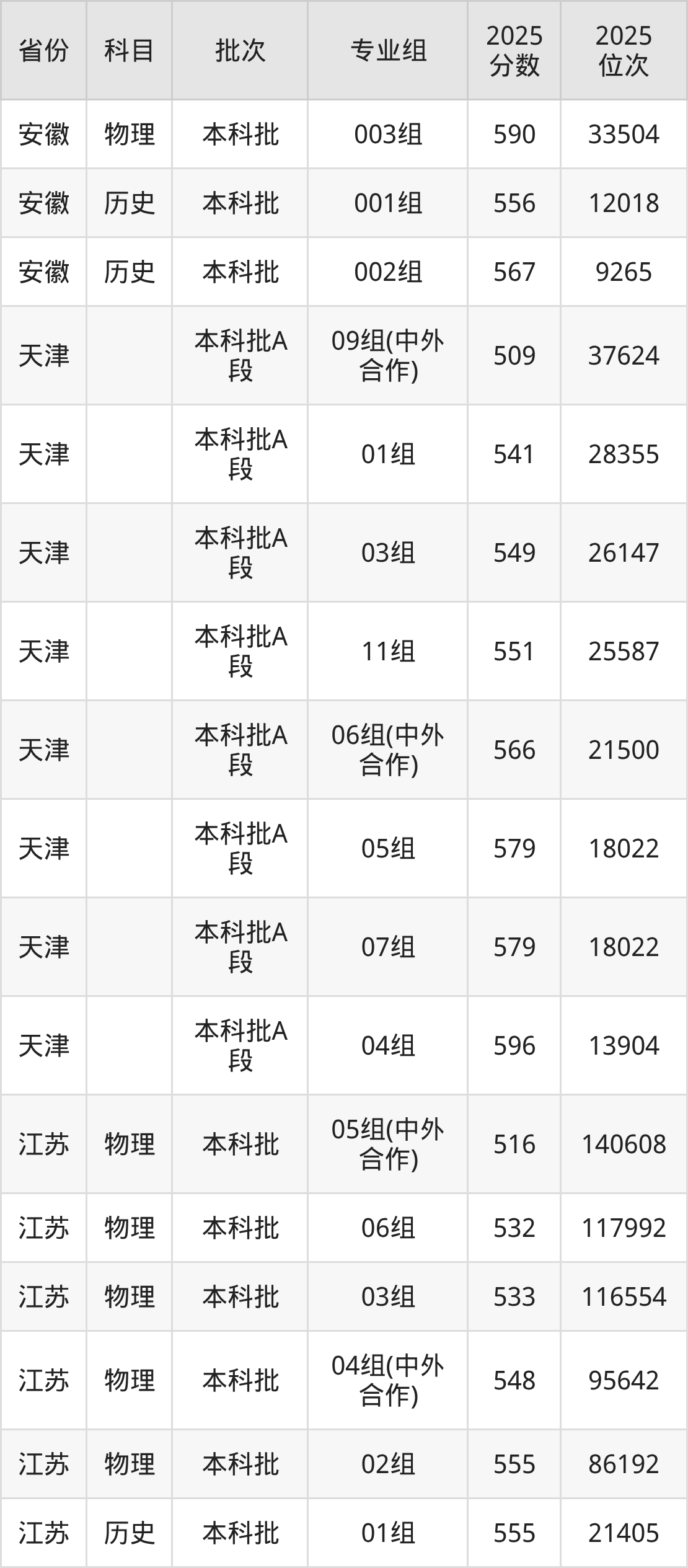 2025年在本科物理类进行招生,各专业组分数线详情如下: