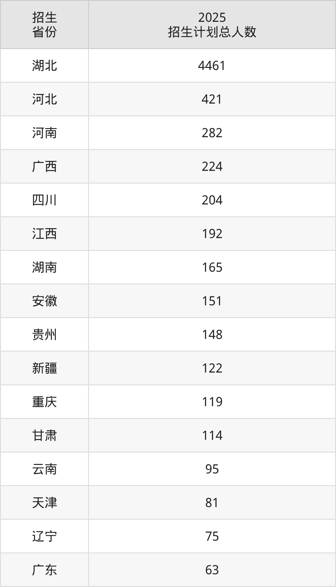 2025年长江大学面向全国28个省市开展本科招生;招生专业共60个,招生人数共7273人。2025年在湖北省招生计划总人数是4461人,其中,长江大学在湖北省招生人数最多的是计算机类。长江大学在各省具体招生人数情况如下表。