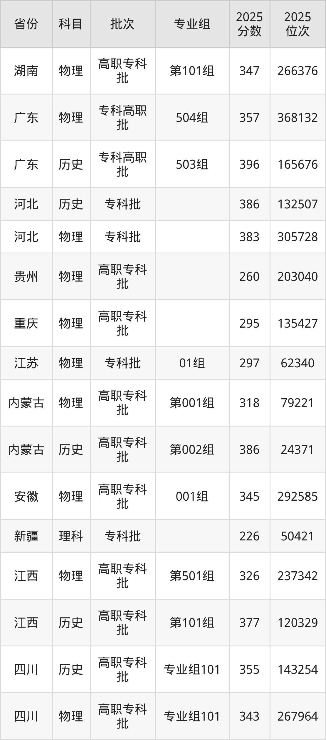2025年在专科物理类进行招生,各专业组分数线详情如下: