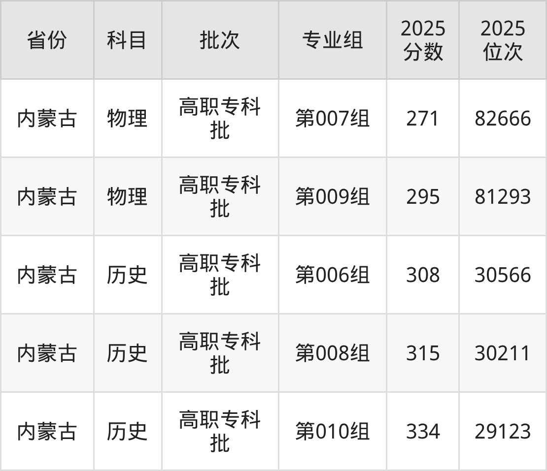 2025年内蒙古体育职业学院全国录取分数线是271分到334分,录取最低在内蒙古物理类(第007组)、录取最高在内蒙古历史类(第010组)。