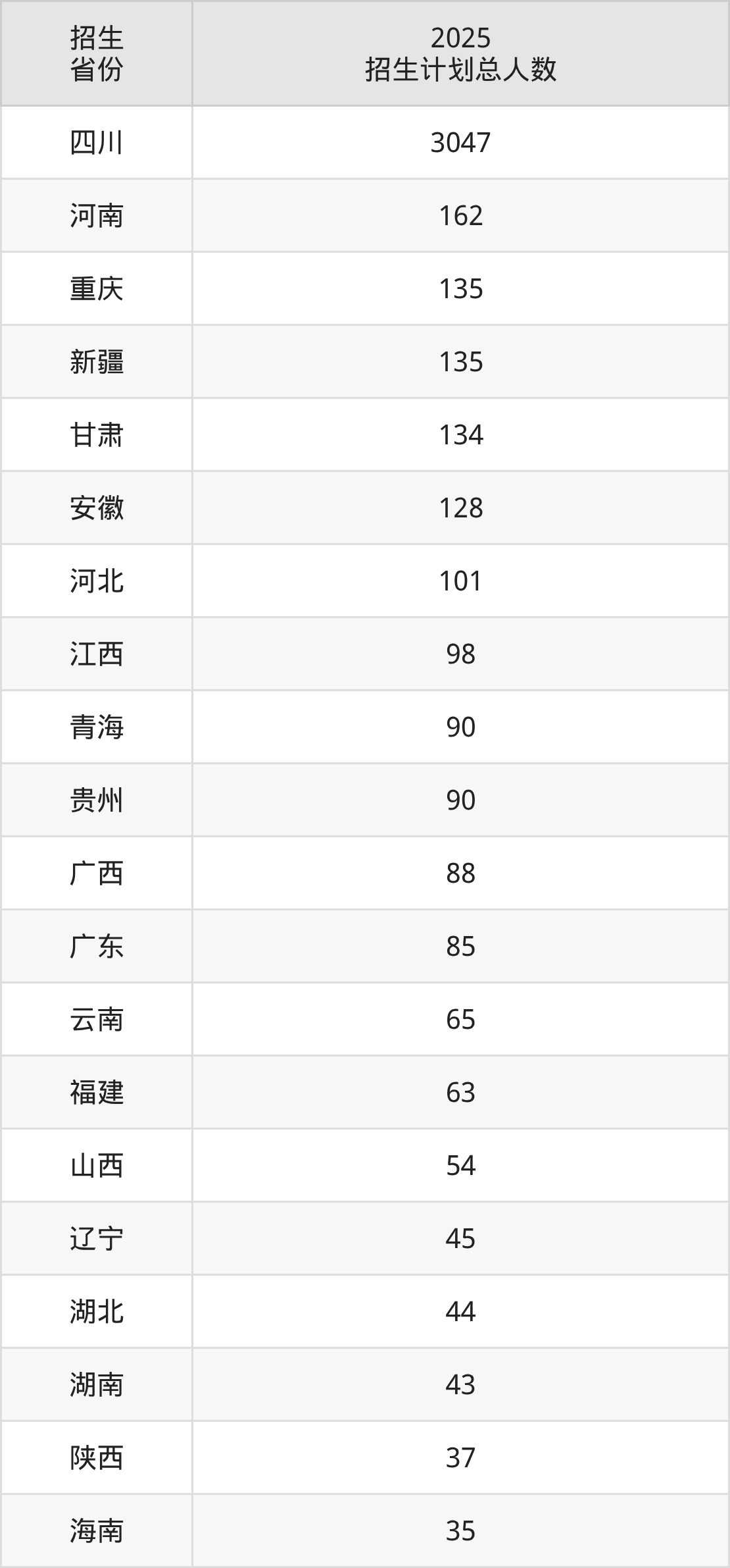 2025年成都大学面向全国29个省市开展本科招生;招生专业共58个,招生人数共4841人。2025年在四川省招生计划总人数是3047人,其中,成都大学在四川省招生人数最多的是护理学。成都大学在各省具体招生人数情况如下表。