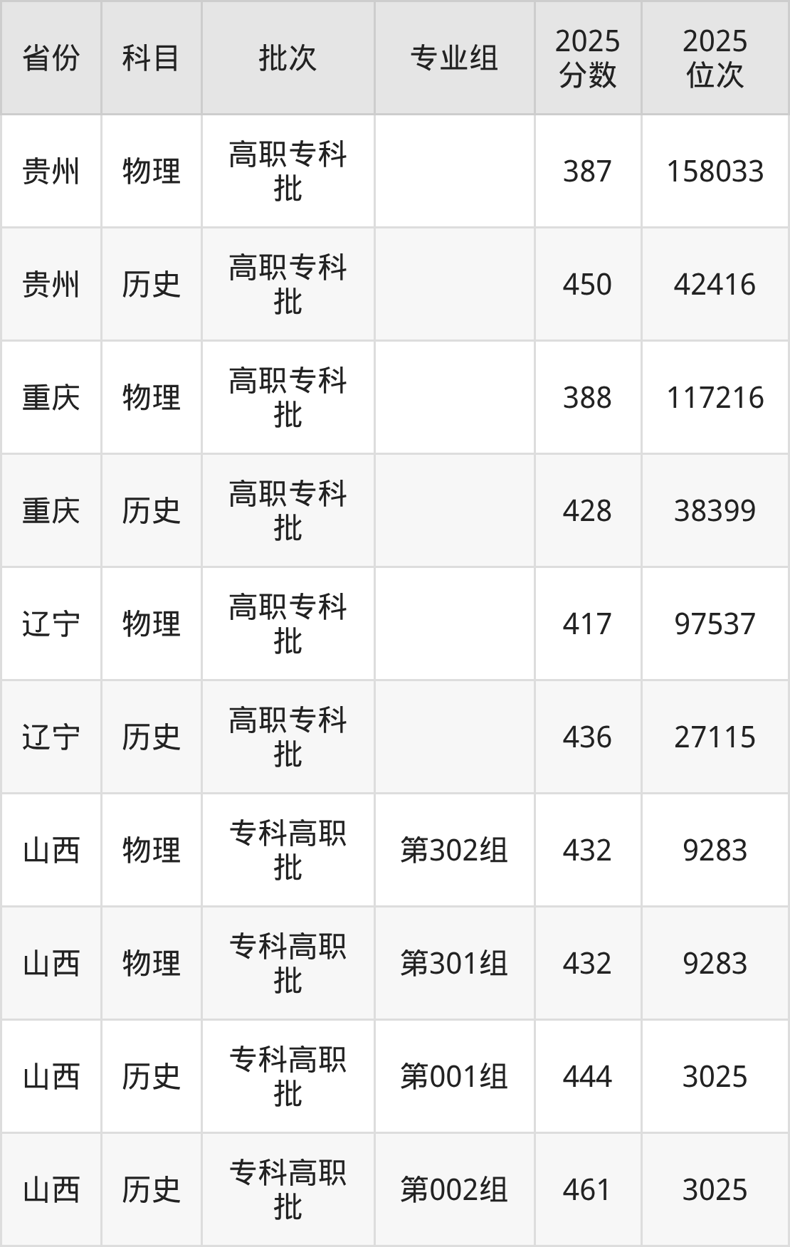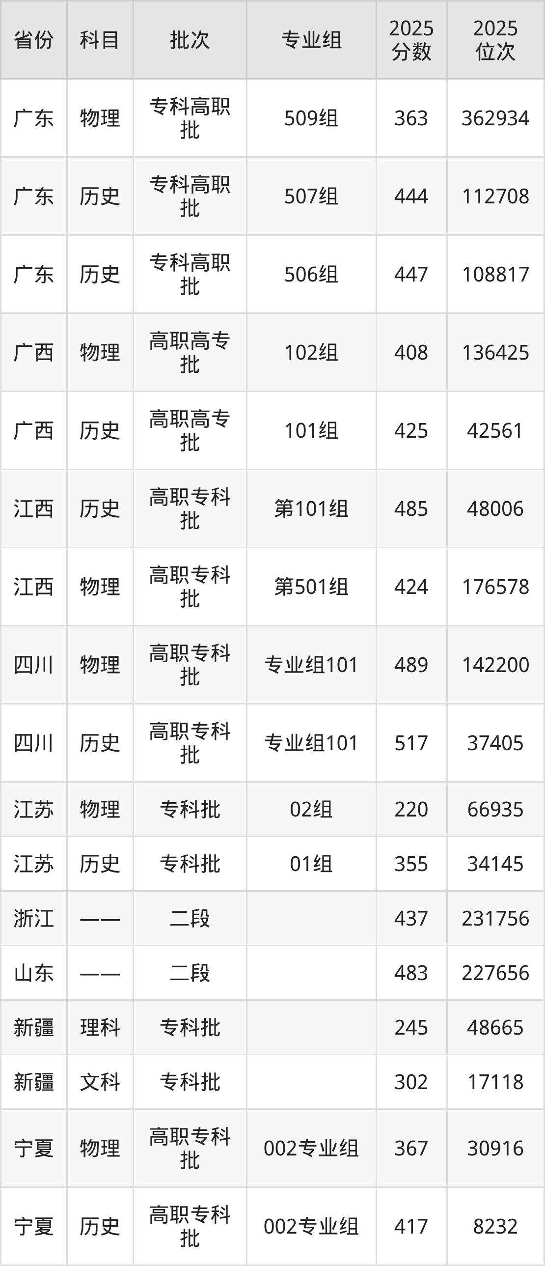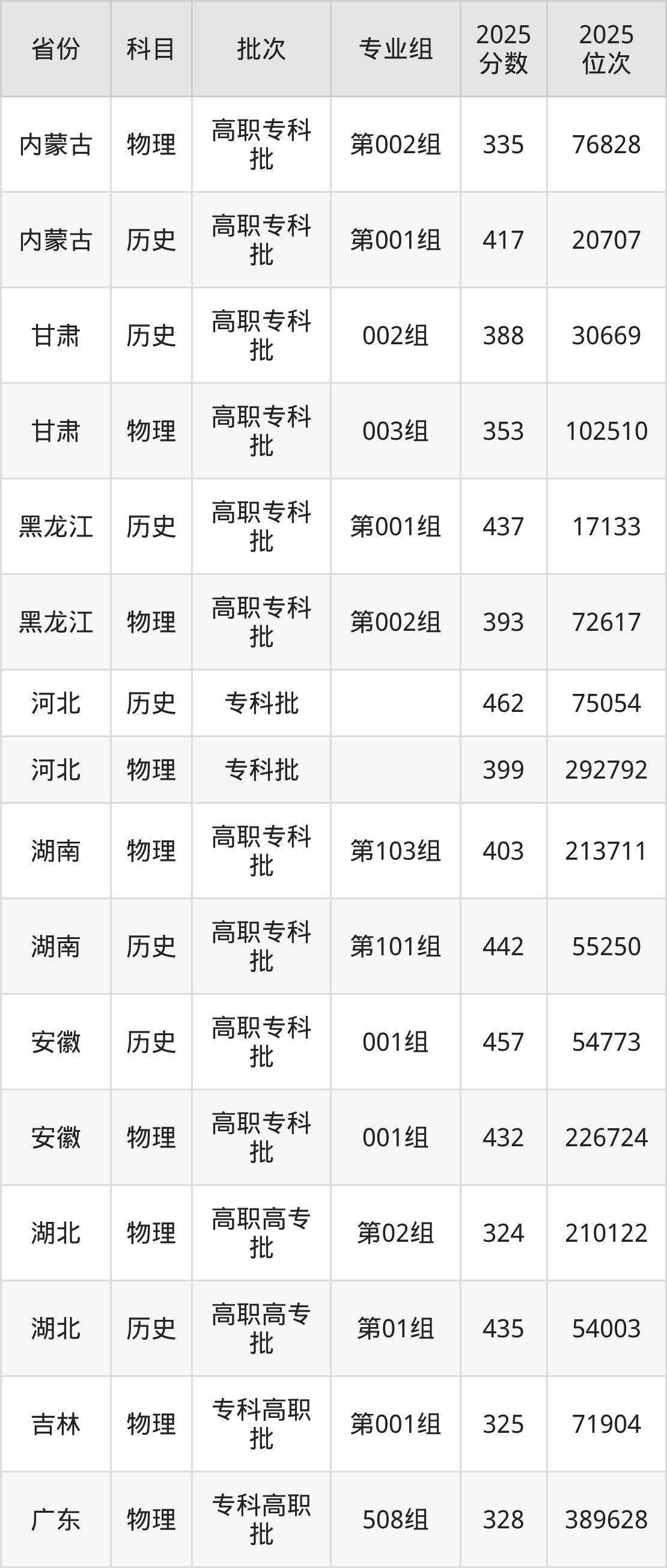 2025年在专科物理类进行招生,各专业组分数线详情如下: