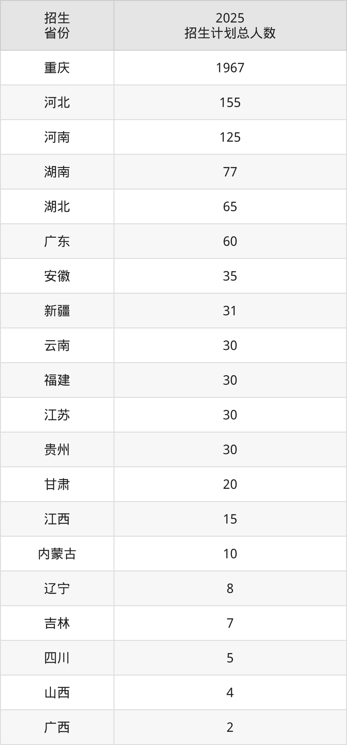 2025年重庆城市管理职业学院面向全国27个省市开展专科招生;招生专业共46个,招生人数共2720人。2025年在重庆市招生计划总人数是1967人,其中,重庆城市管理职业学院在重庆市招生人数最多的是大数据与会计。重庆城市管理职业学院在各省具体招生人数情况如下表。