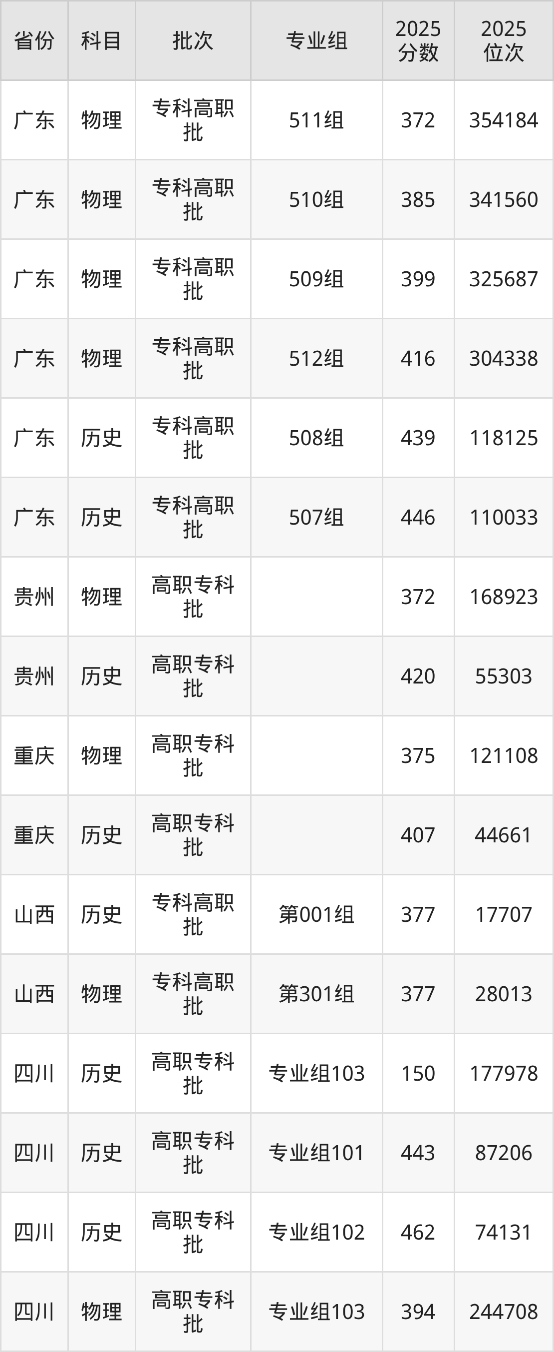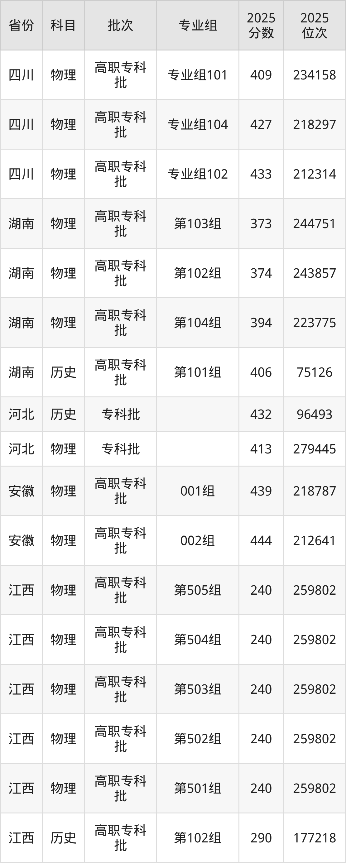 2025年在专科物理类进行招生,各专业组分数线详情如下: