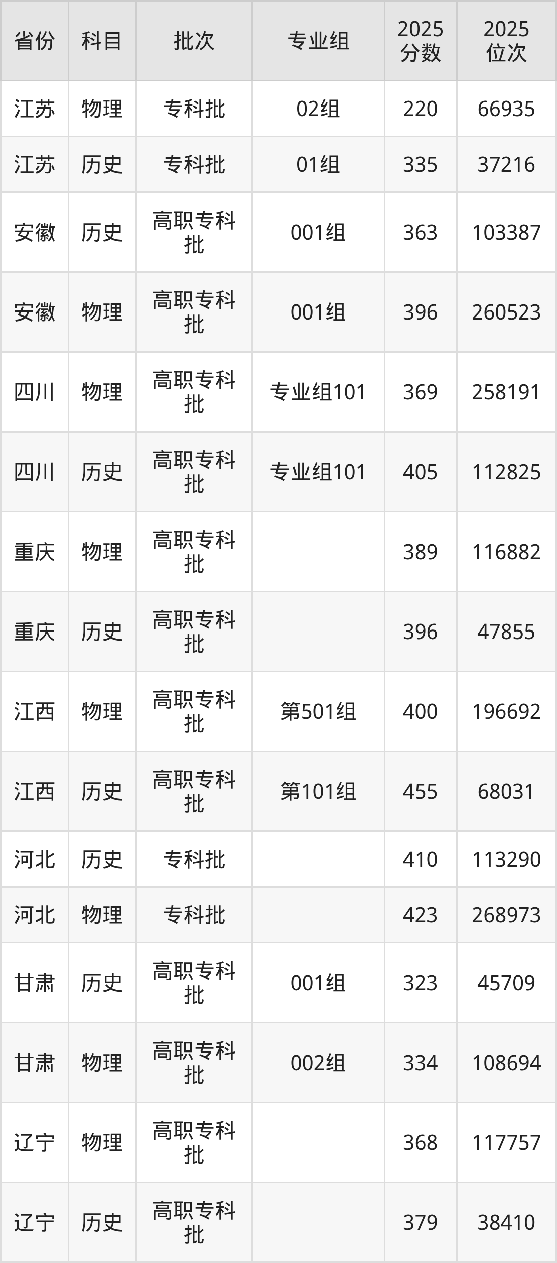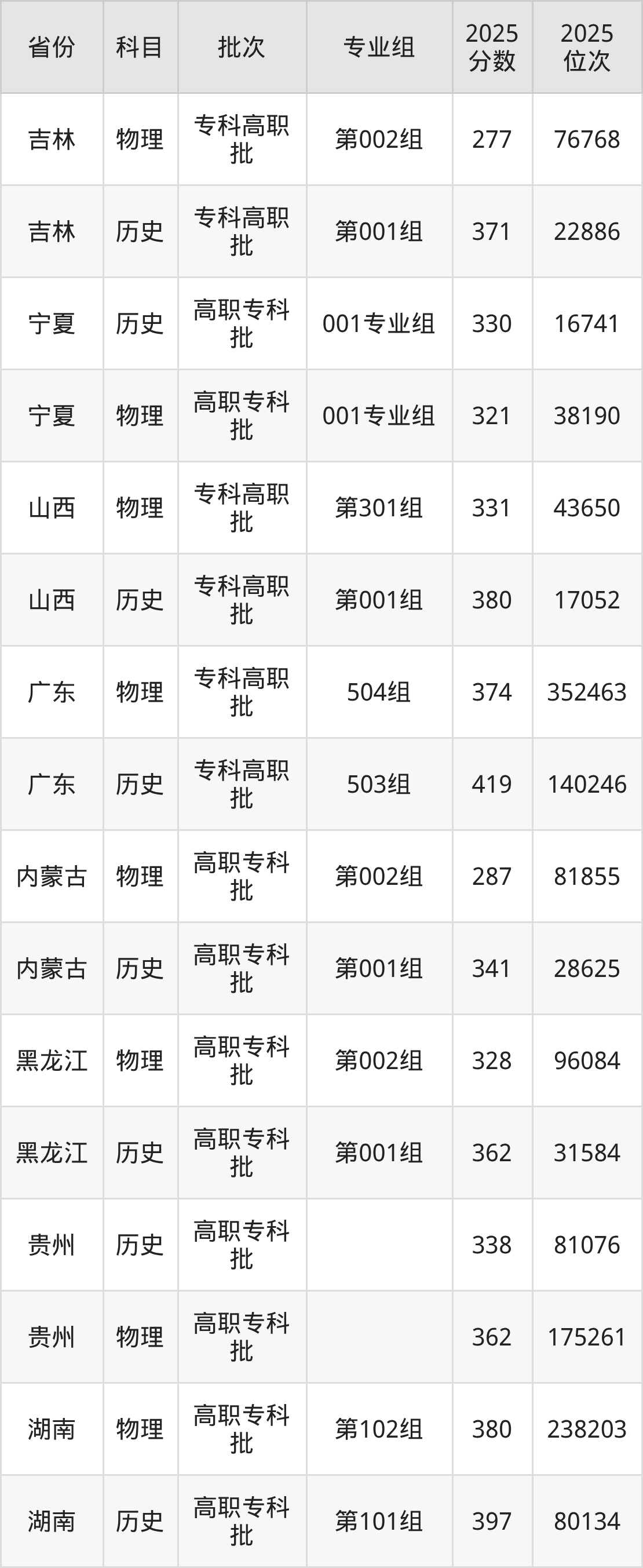 湖南工程职业技术学院专业组101:2025年投档录取最低分为369分,录取最低位次为258191名。