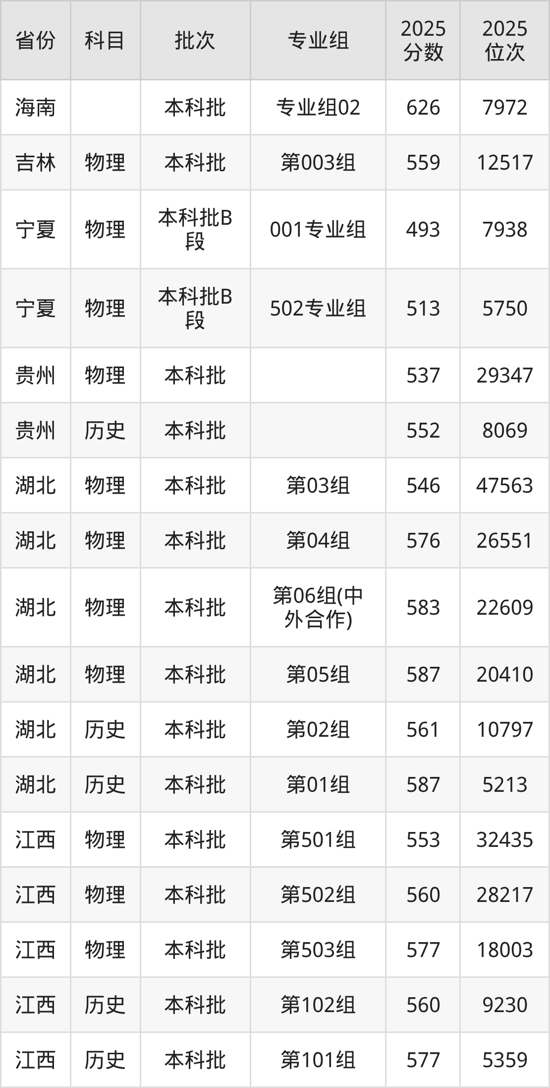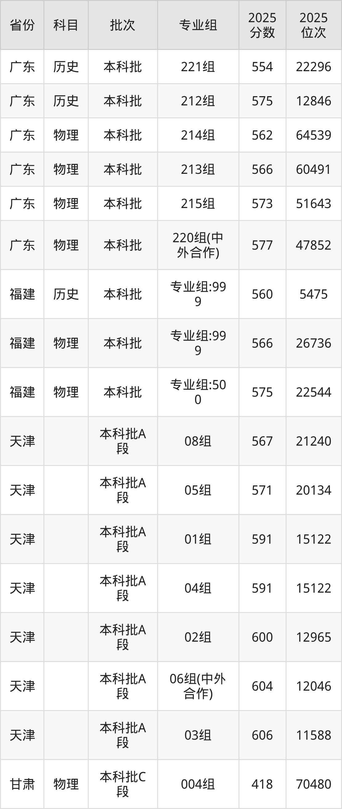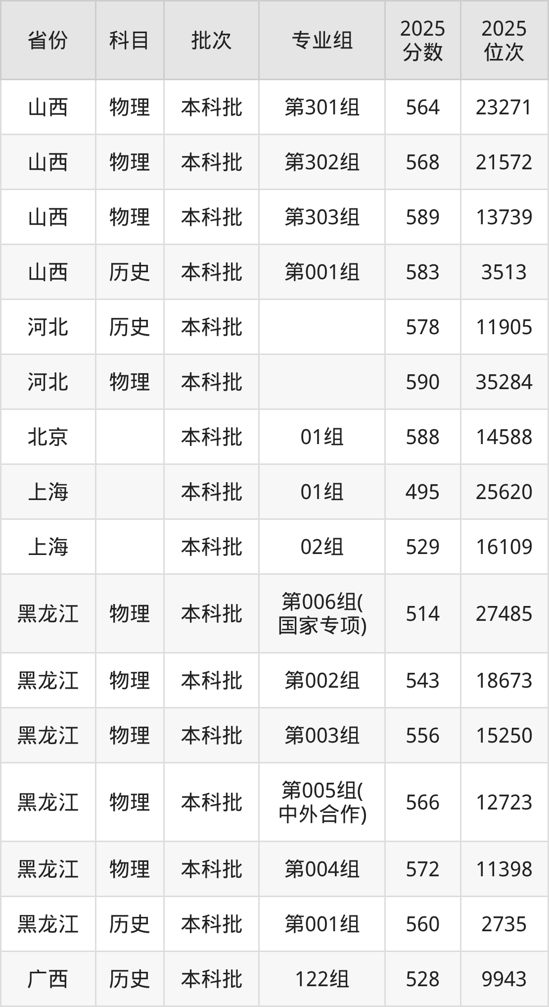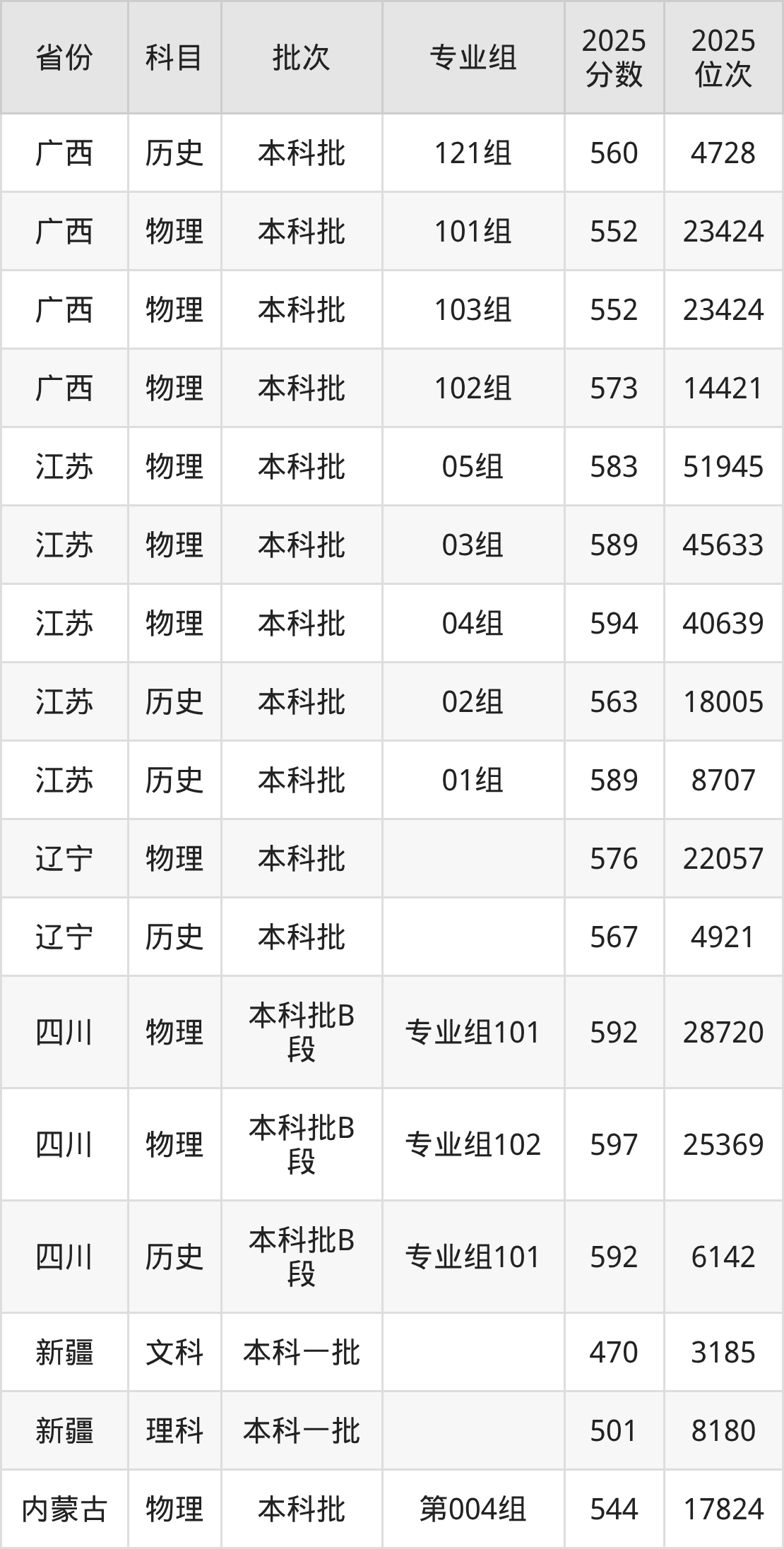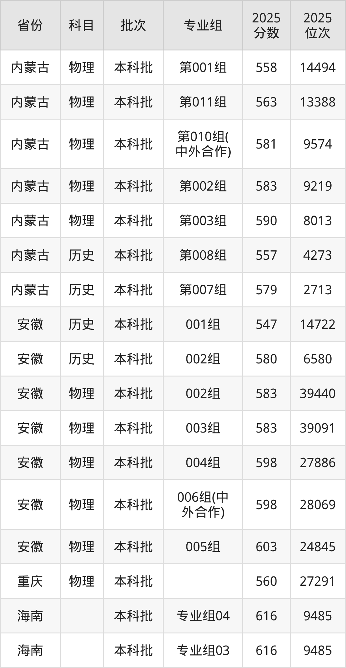 2025年在本科物理类进行招生,各专业组分数线详情如下: