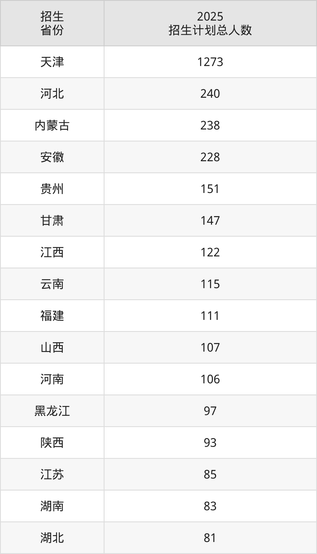 2025年天津工业大学面向全国28个省市开展本科招生;招生专业共48个,招生人数共3837人。2025年在天津市招生计划总人数是1273人,其中,天津工业大学在天津市招生人数最多的是软件工程。天津工业大学在各省具体招生人数情况如下表。