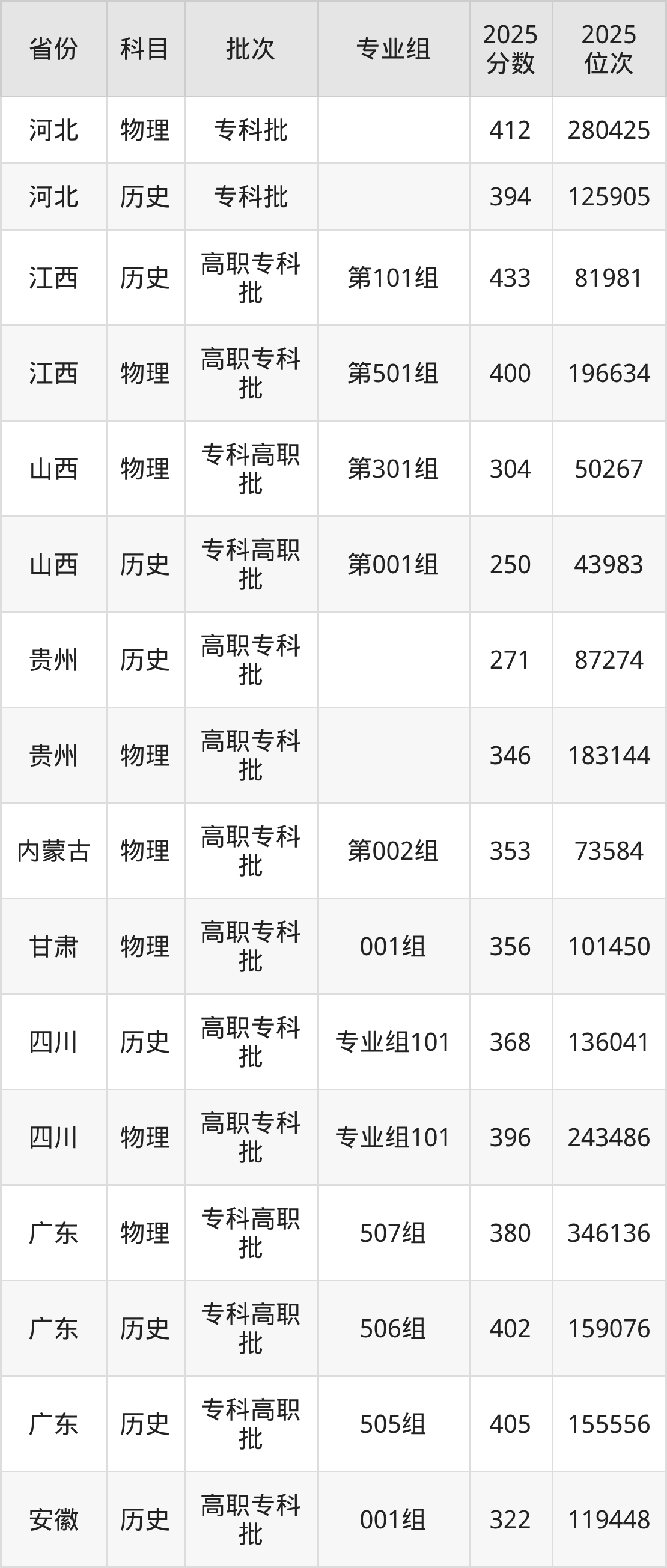 2025年在专科物理类进行招生,各专业组分数线详情如下: