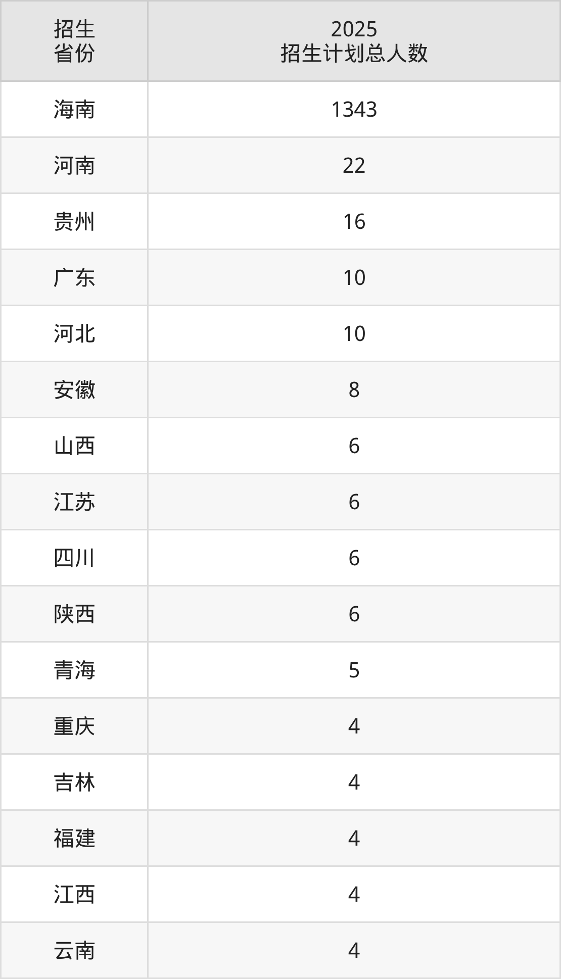 2025年海南软件职业技术学院面向全国20个省市开展专科招生;招生专业共25个,招生人数共1468人。2025年在海南省招生计划总人数是1343人,其中,海南软件职业技术学院在海南省招生人数最多的是游戏艺术设计。海南软件职业技术学院在各省具体招生人数情况如下表。