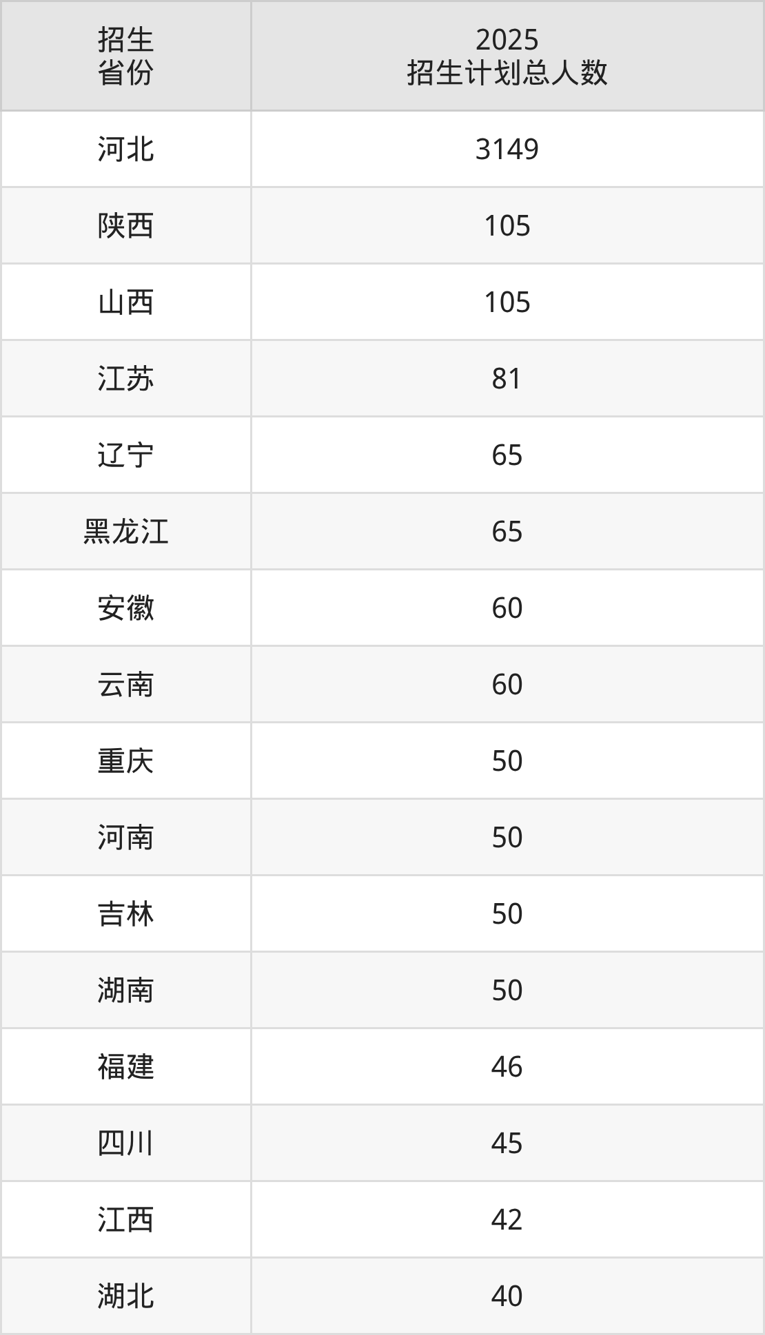 2025年河北经贸大学面向全国22个省市开展本科招生;招生专业共43个,招生人数共4224人。2025年在河北省招生计划总人数是3149人,其中,河北经贸大学在河北省招生人数最多的是法学。河北经贸大学在各省具体招生人数情况如下表。