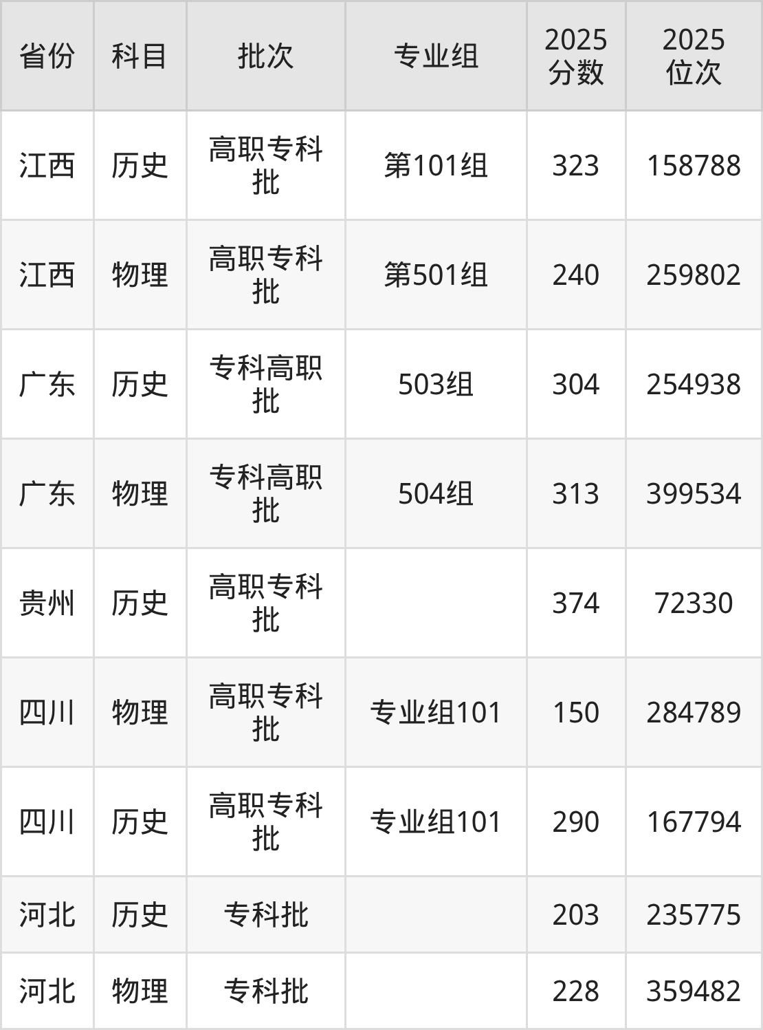 2025年在专科历史类进行招生,各专业组分数线详情如下: