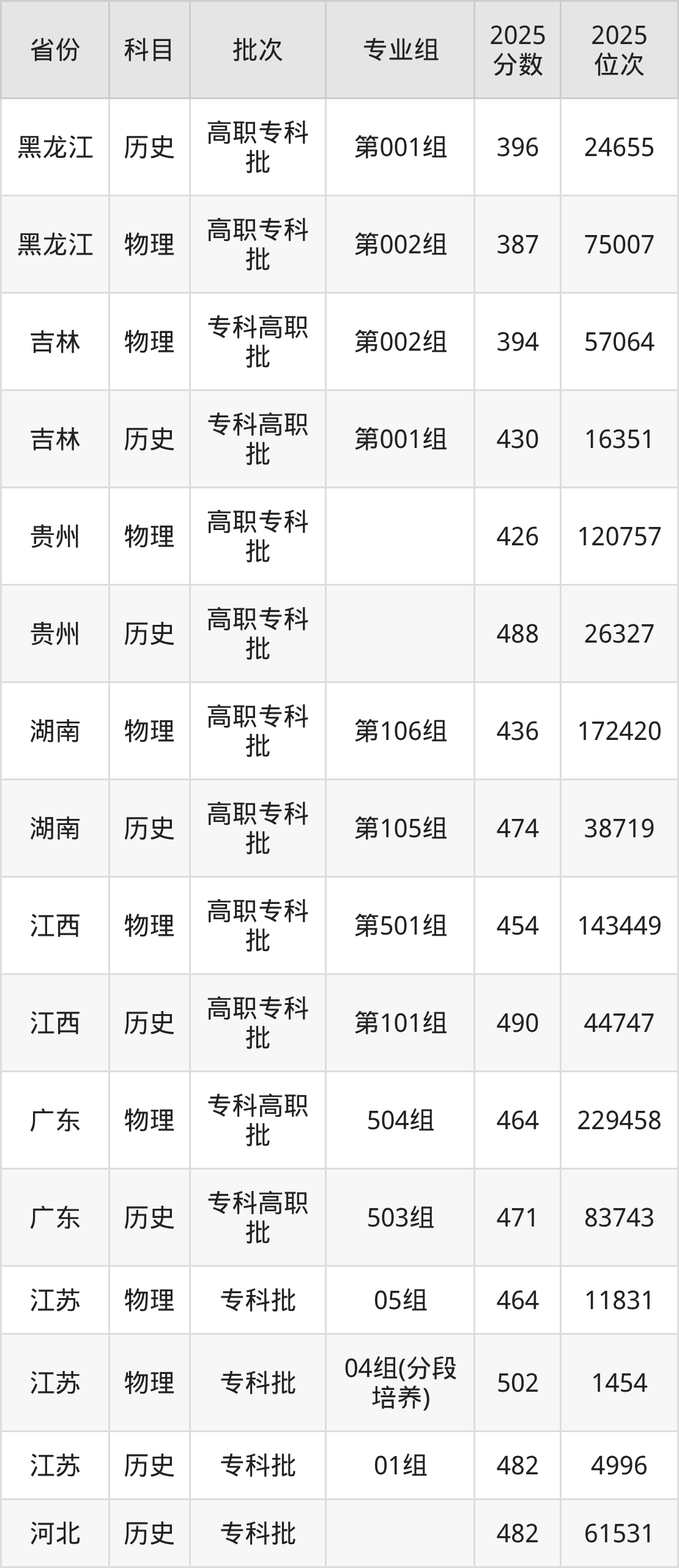 2025年南京信息职业技术学院全国录取分数线是387分到503分,录取最低在黑龙江物理类(第002组)、录取最高在河北历史类。各省各专业组最低分具有差异,详情如下: