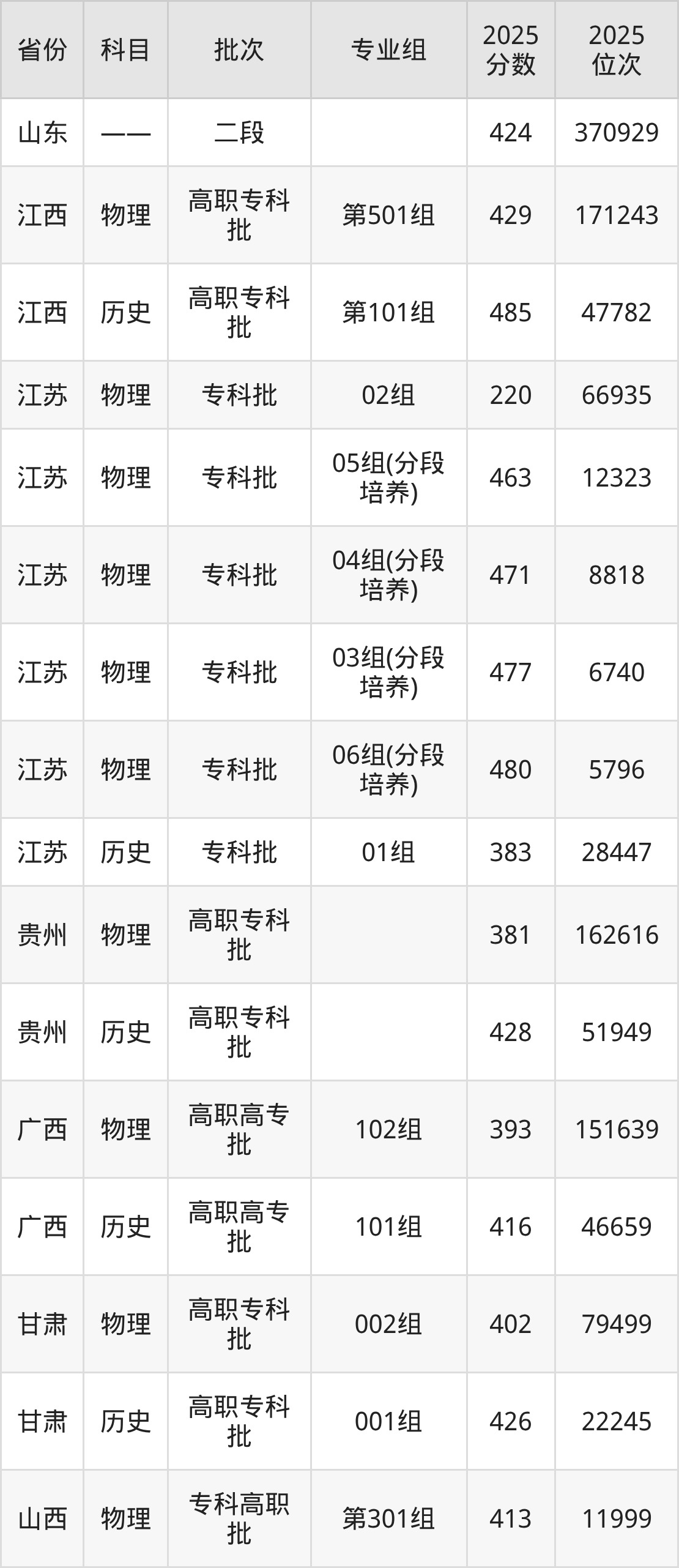 江苏农牧科技职业学院第002组:2025年投档录取最低分为374分,录取最低位次为68766名。