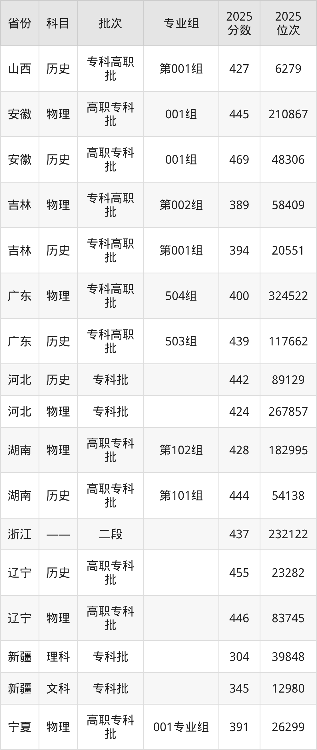普通类专科物理类最低428分,专科历史类最低444分
