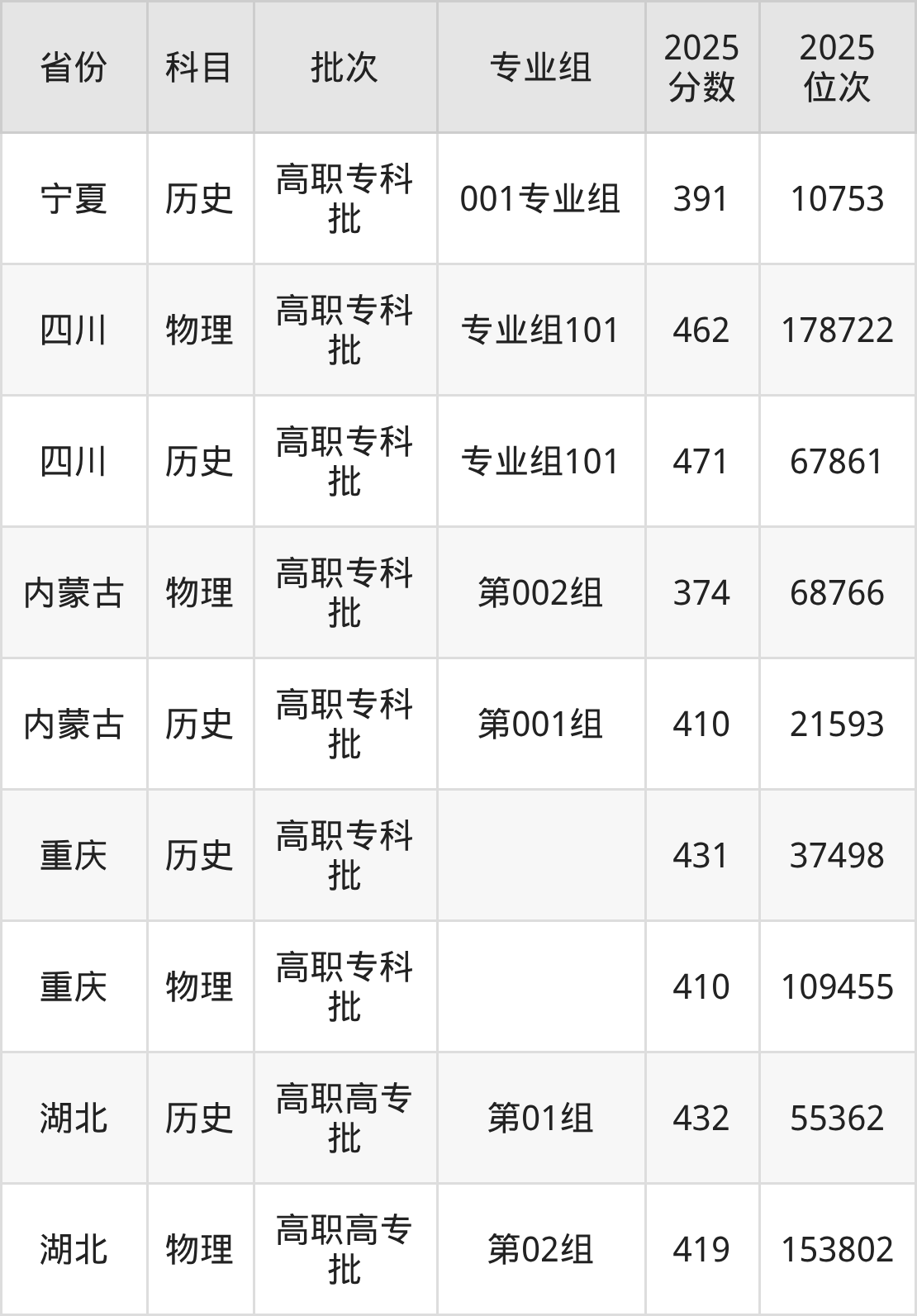 普通类专科物理类最低374分,专科历史类最低410分