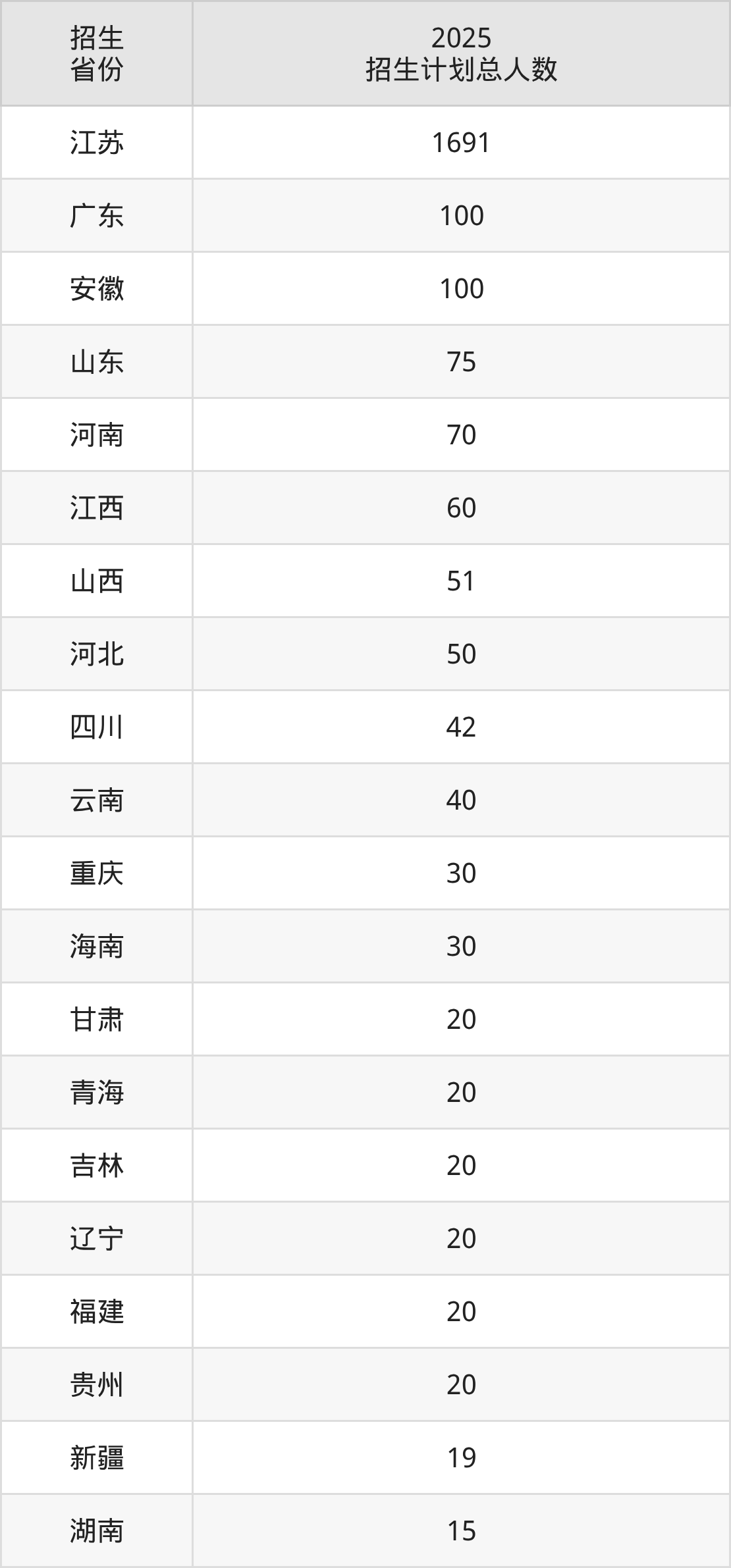2025年江苏农牧科技职业学院面向全国24个省市开展专科招生;招生专业共32个,招生人数共2548人。2025年在江苏省招生计划总人数是1691人,其中,江苏农牧科技职业学院在江苏省招生人数最多的是动物医学。江苏农牧科技职业学院在各省具体招生人数情况如下表。
