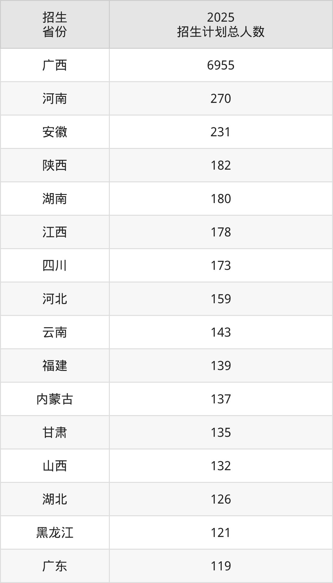 2025年桂林理工大学面向全国28个省市开展本科招生;招生专业共61个,招生人数共5869人。2025年在广西壮族自治区招生计划总人数是6955人,其中,桂林理工大学在广西壮族自治区招生人数最多的是少数民族预科班。桂林理工大学在各省具体招生人数情况如下表。