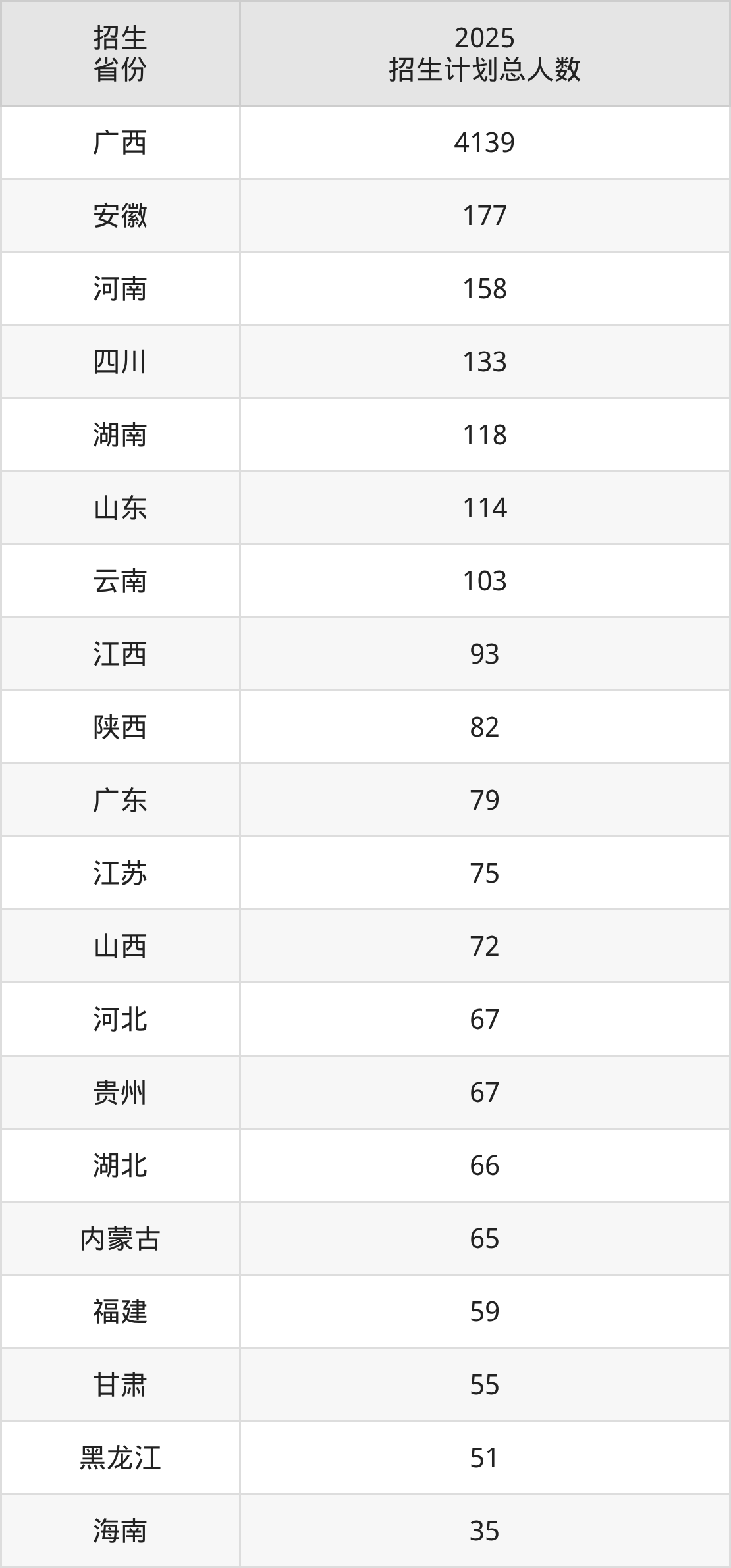 2025年桂林理工大学面向全国29个省市开展本科招生;招生专业共61个,招生人数共5983人。2025年在广西壮族自治区招生计划总人数是4139人,其中,桂林理工大学在广西壮族自治区招生人数最多的是少数民族预科班。桂林理工大学在各省具体招生人数情况如下表。