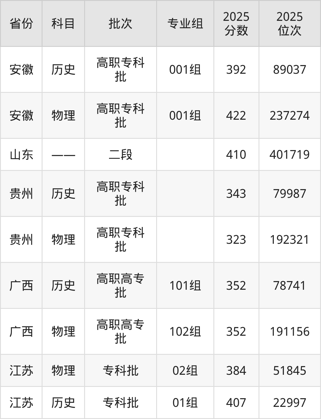 普通类专科历史类最低392分,专科物理类最低422分