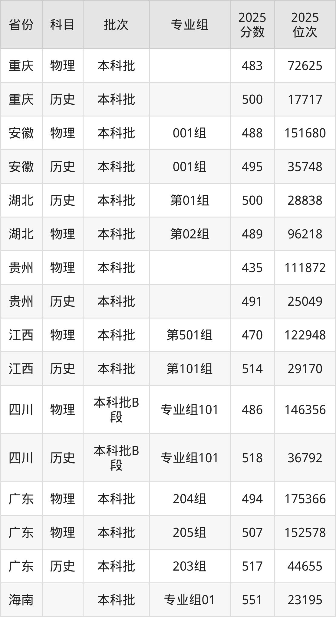 2025年投档录取最低分为483分,录取最低位次为72625名。