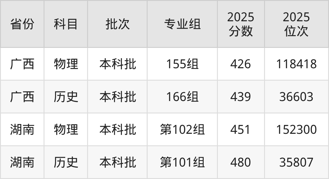 2025年南宁职业技术大学全国录取分数线是426分到551分,录取最低在广西物理类(155组)、录取最高在海南(专业组01)。各省各专业组最低分具有差异,详情如下: