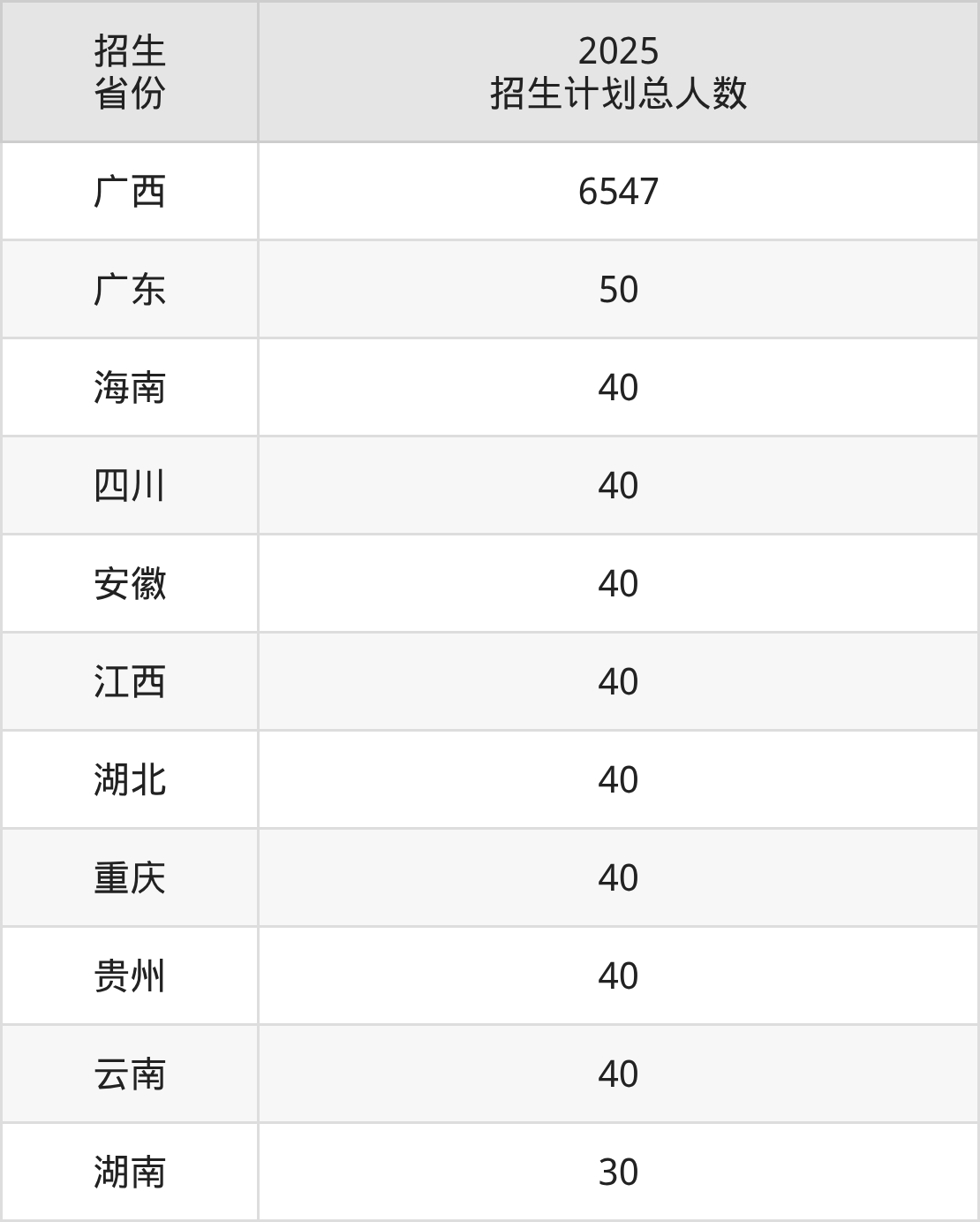 2025年南宁职业技术大学面向全国11个省市开展本科招生;招生专业共9个,招生人数共1680人。2025年在广西壮族自治区招生计划总人数是6547人,其中,南宁职业技术大学在广西壮族自治区招生人数最多的是软件技术。南宁职业技术大学在各省具体招生人数情况如下表。
