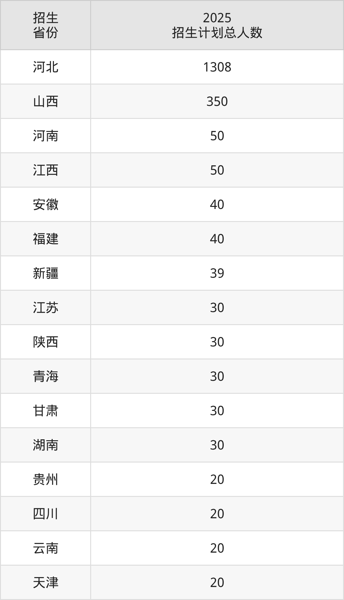 2025年河北轨道运输职业技术学院面向全国21个省市开展专科招生;招生专业共44个,招生人数共2160人。2025年在河北省招生计划总人数是1308人,其中,河北轨道运输职业技术学院在河北省招生人数最多的是民航运输服务。河北轨道运输职业技术学院在各省具体招生人数情况如下表。