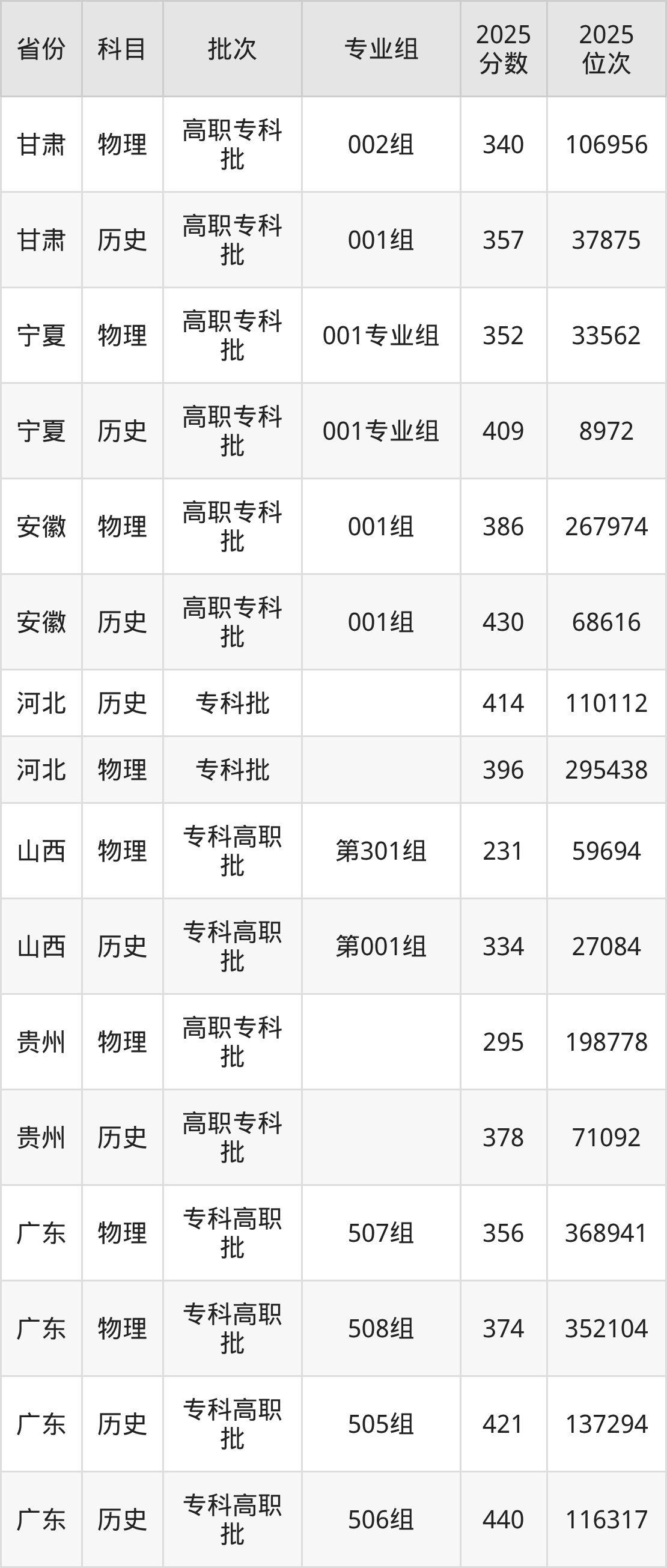 普通类专科物理类最低340分,专科历史类最低357分