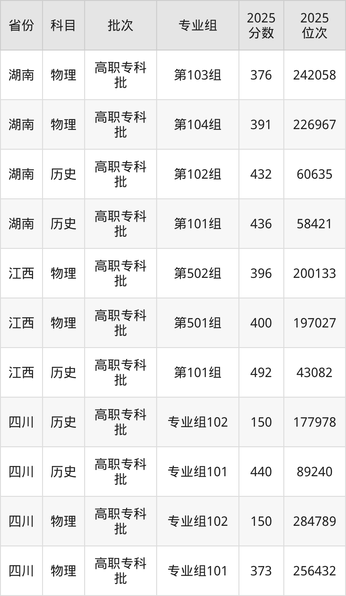 普通类专科物理类最低376分,专科历史类最低432分