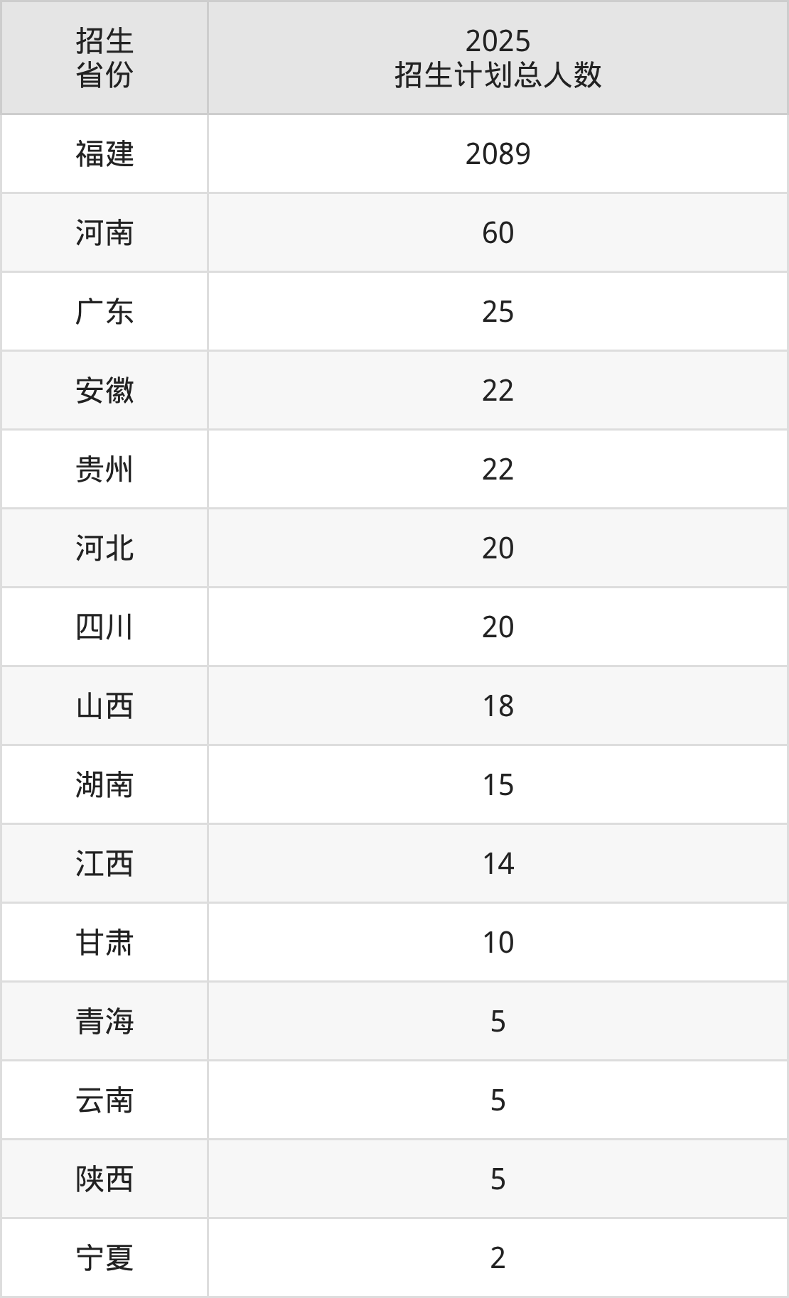2025年闽江师范高等专科学校面向全国15个省市开展专科招生;招生专业共36个,招生人数共2332人。2025年在福建省招生计划总人数是2089人,其中,闽江师范高等专科学校在福建省招生人数最多的是护理。闽江师范高等专科学校在各省具体招生人数情况如下表。