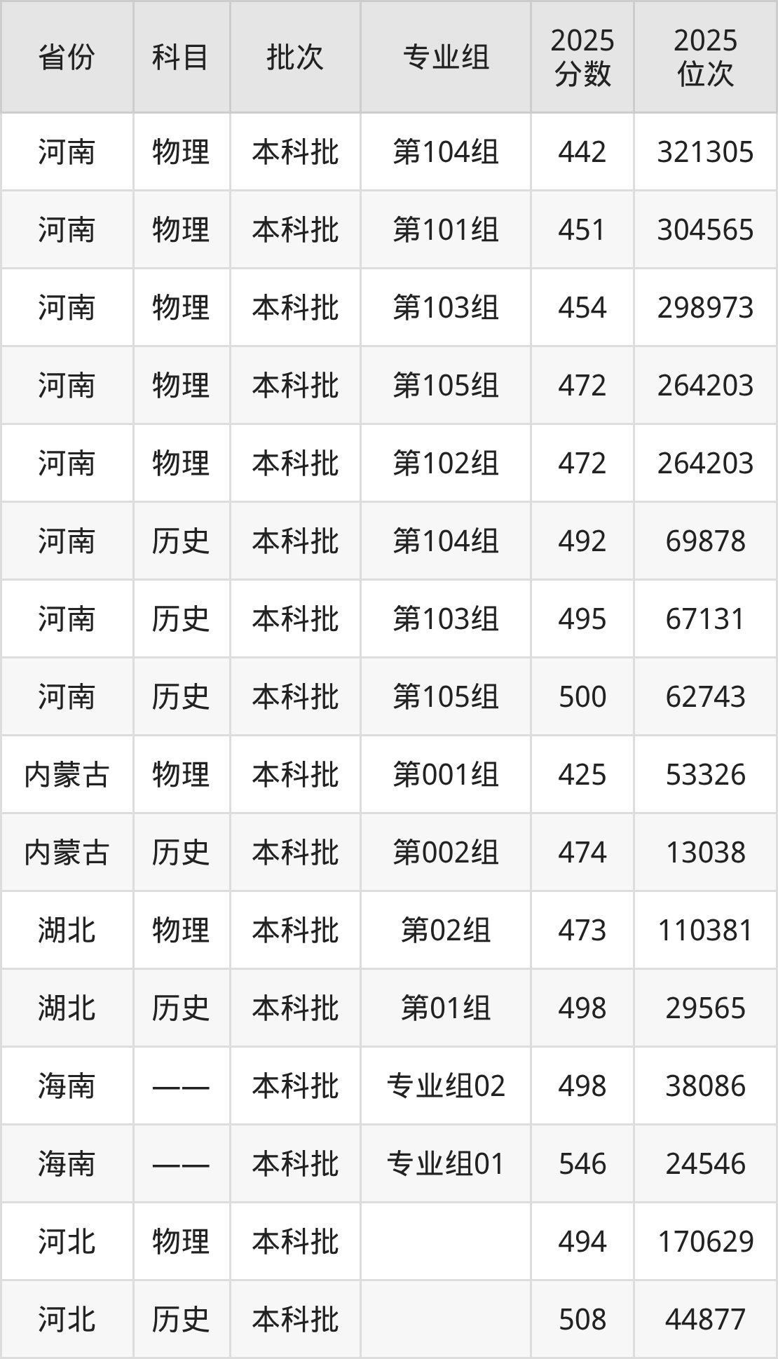 2025年在本科理科进行招生,各专业组分数线详情如下: