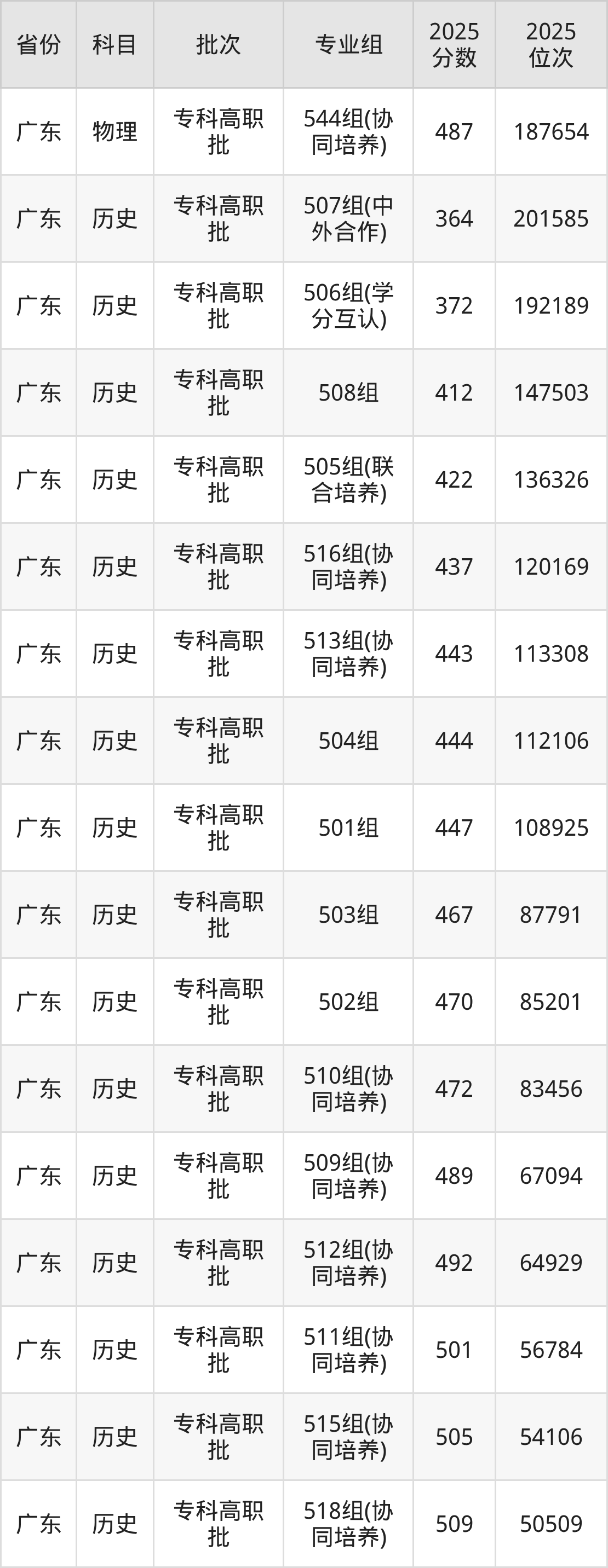 广东农工商职业技术学院507组(中外合作):2025年投档录取最低分为364分,录取最低位次为201585名。