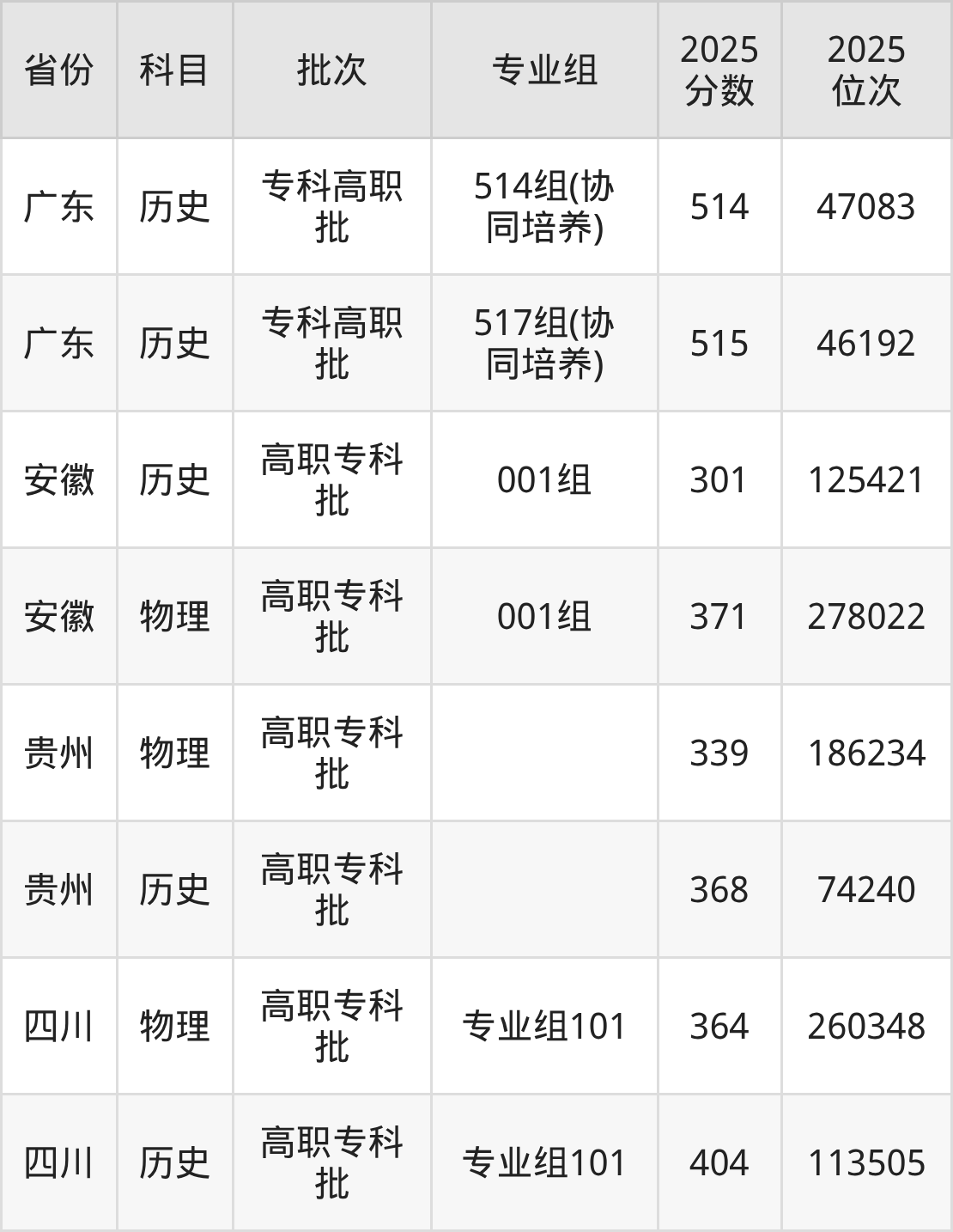 2025年广东农工商职业技术学院全国录取分数线是222分到515分,录取最低在河北历史类、录取最高在广东历史类(517组(协同培养))。各省各专业组最低分具有差异,详情如下: