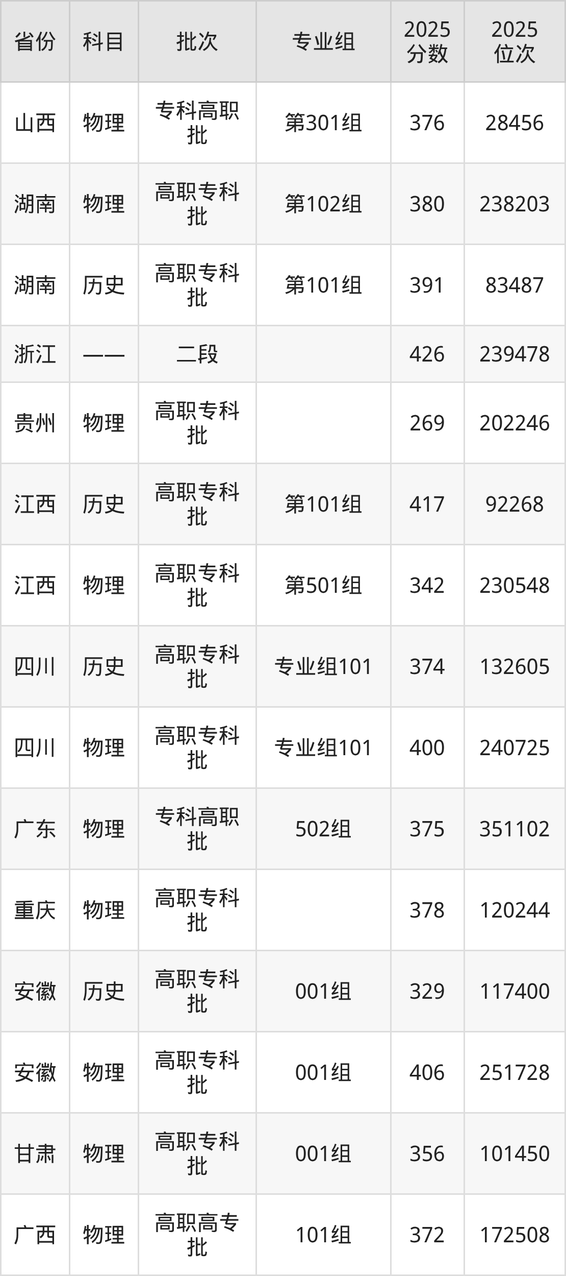 2025年在专科物理类进行招生,各专业组分数线详情如下: