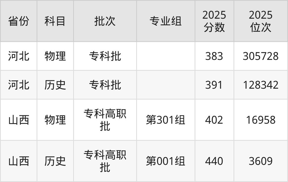 河北政法职业学院2025招生录取分数线已公布,2025年河北政法职业学院在河北省专科物理类投档录取最低分383分,专科历史类投档录取最低分391分。在山西省专科历史类投档录取最低分440分,更多省份具体录取分数线详见下文。