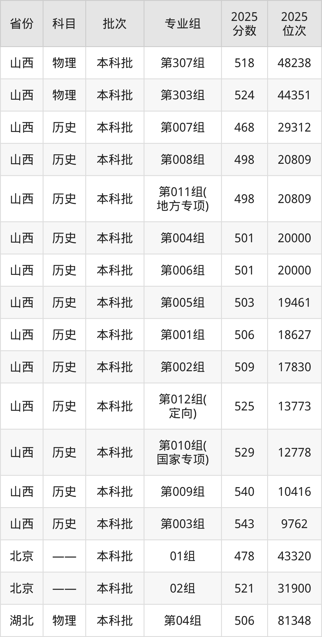 山西大同大学第011组(地方专项计划):2025年投档录取最低分为498分,录取最低位次为20809名。