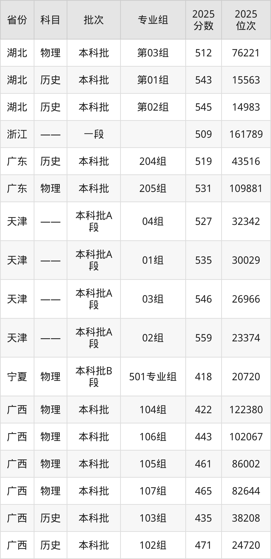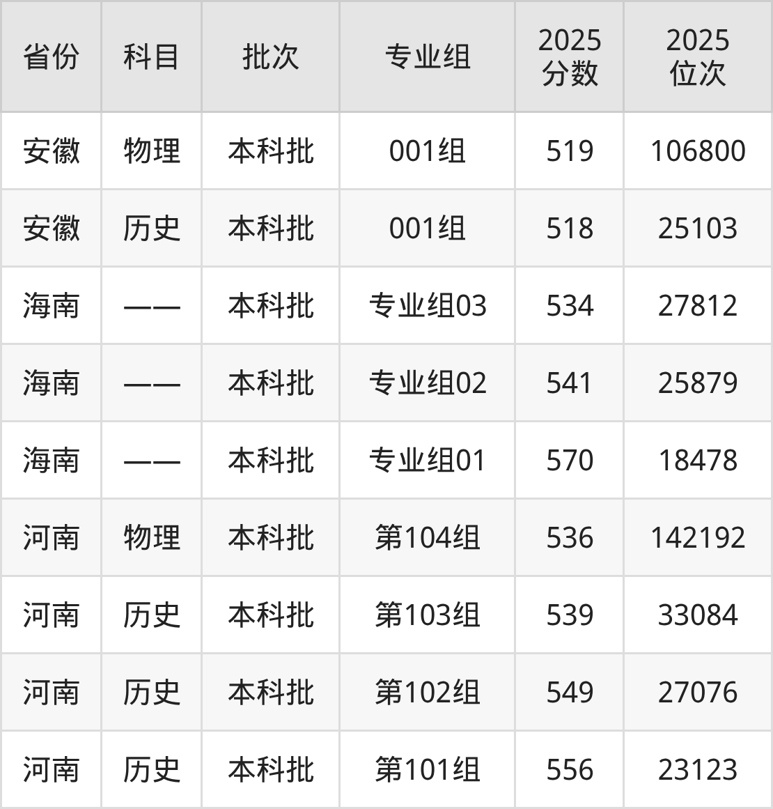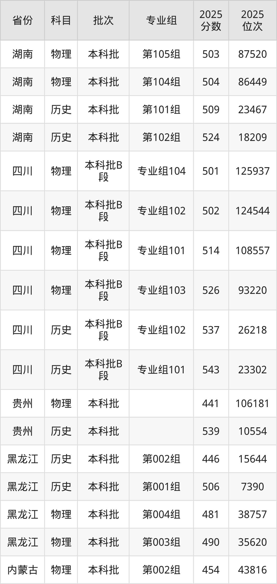 2025年在本科理科进行招生,各专业组分数线详情如下: