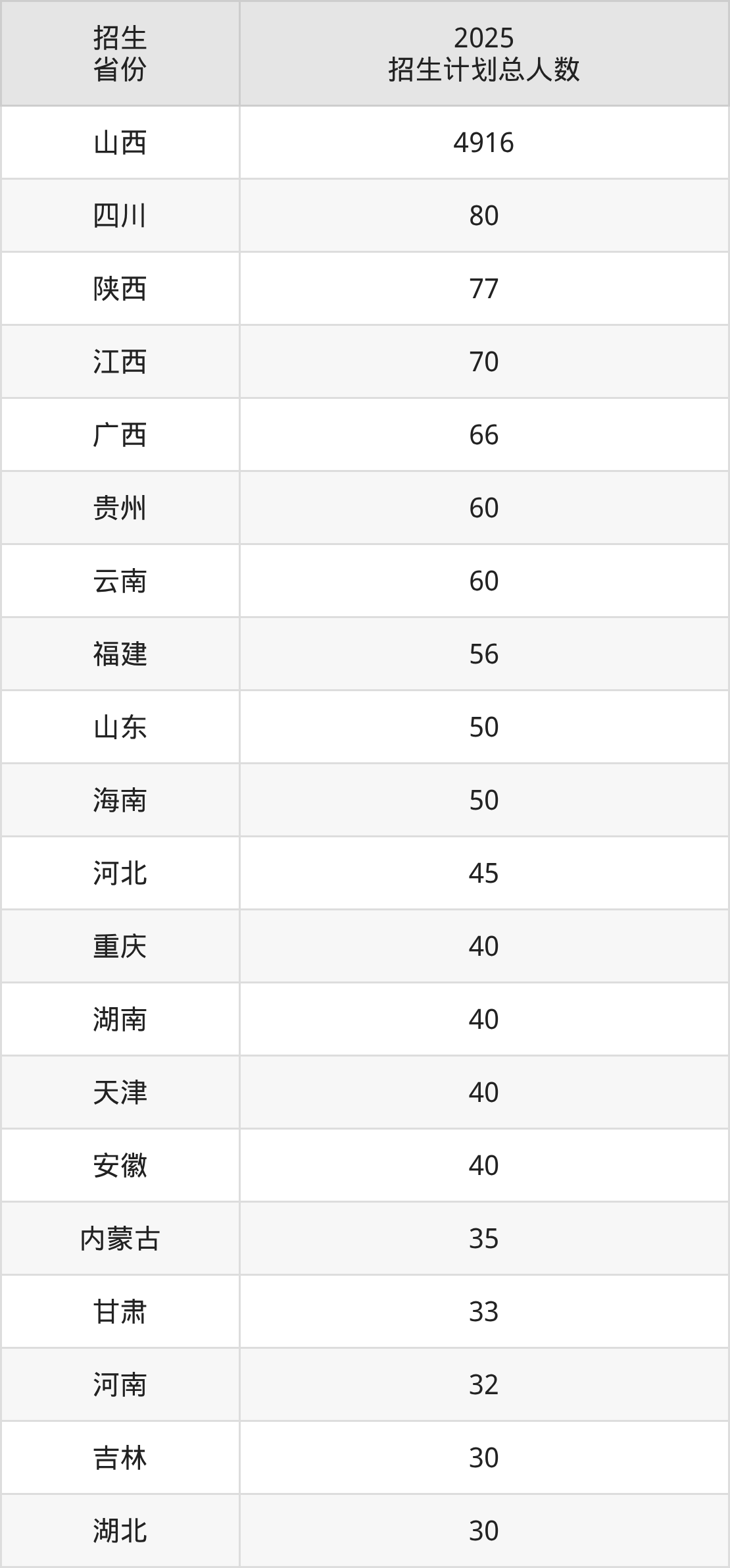 2025年山西大同大学面向全国29个省市开展本科招生;招生专业共62个,招生人数共6004人。2025年在山西省招生计划总人数是4916人,其中,山西大同大学在山西省招生人数最多的是临床医学。山西大同大学在各省具体招生人数情况如下表。
