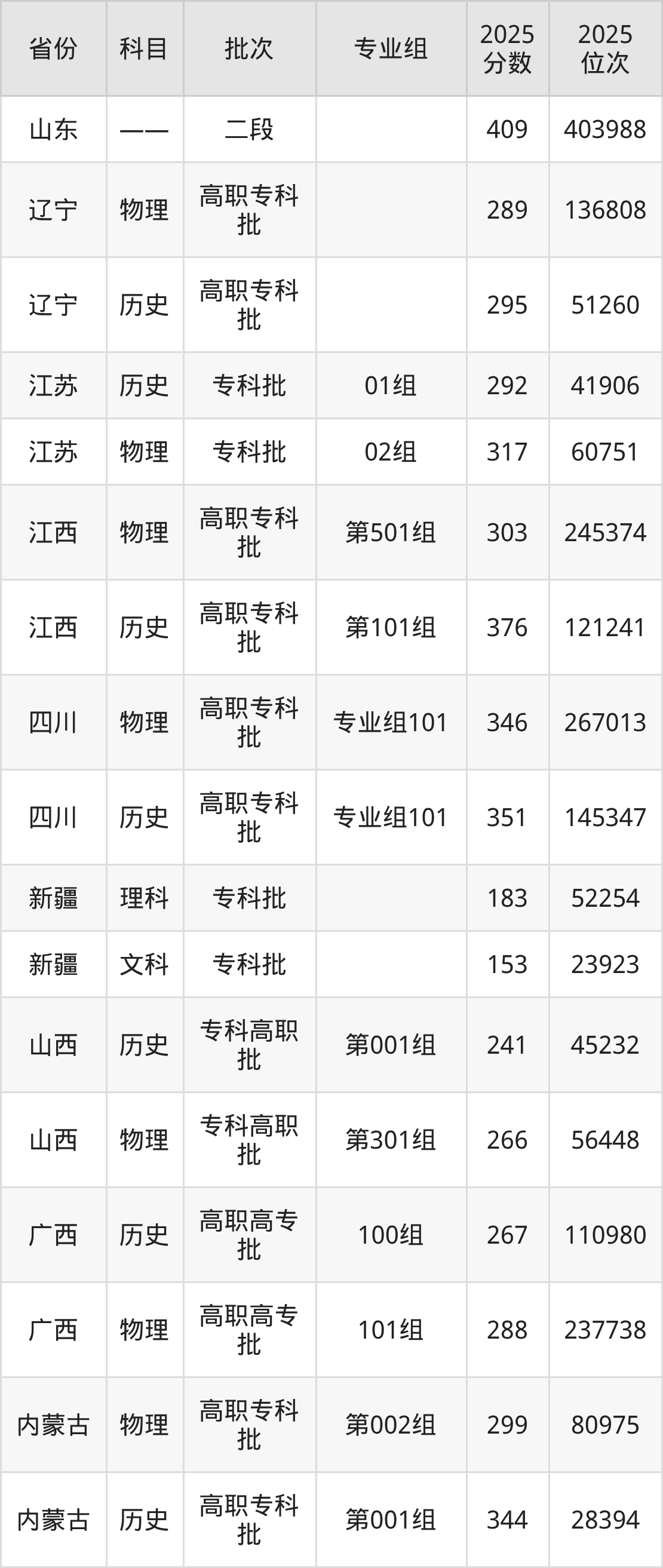 普通类专科物理类最低299分,专科历史类最低344分