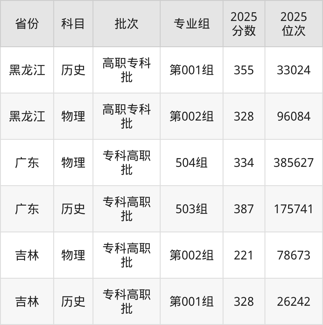 普通类专科物理类最低303分,专科历史类最低376分
