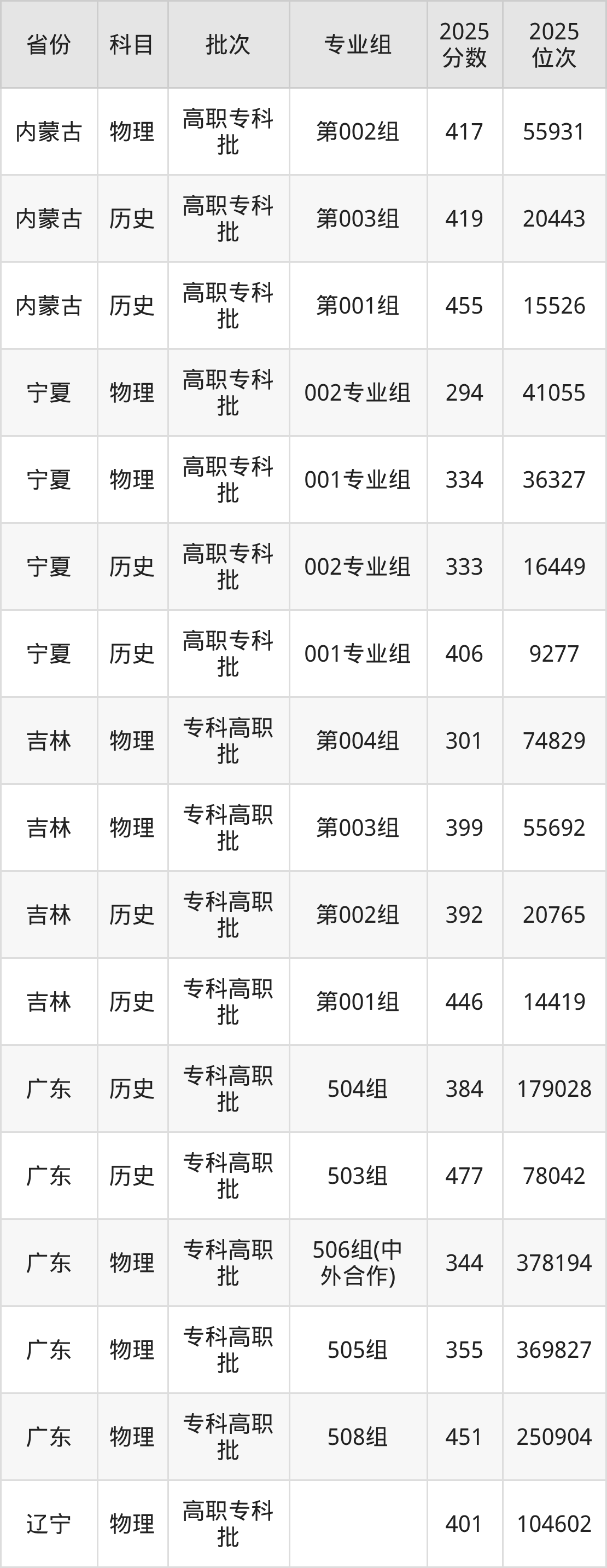 枣庄职业学院第002组:2025年投档录取最低分为417分,录取最低位次为55931名。