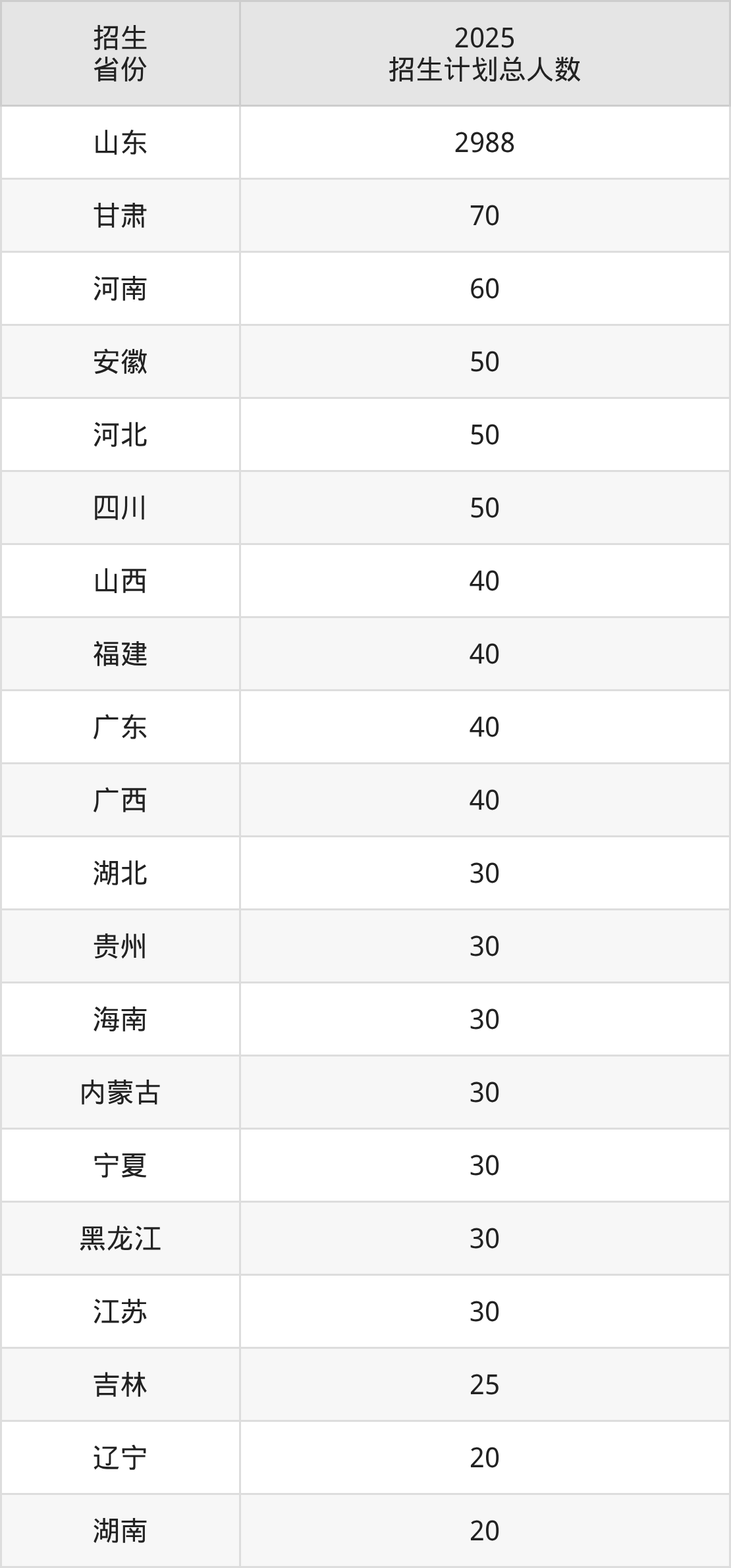 2025年枣庄职业学院面向全国20个省市开展专科招生;招生专业共47个,招生人数共3703人。2025年在山东省招生计划总人数是2988人,其中,枣庄职业学院在山东省招生人数最多的是护理。枣庄职业学院在各省具体招生人数情况如下表。