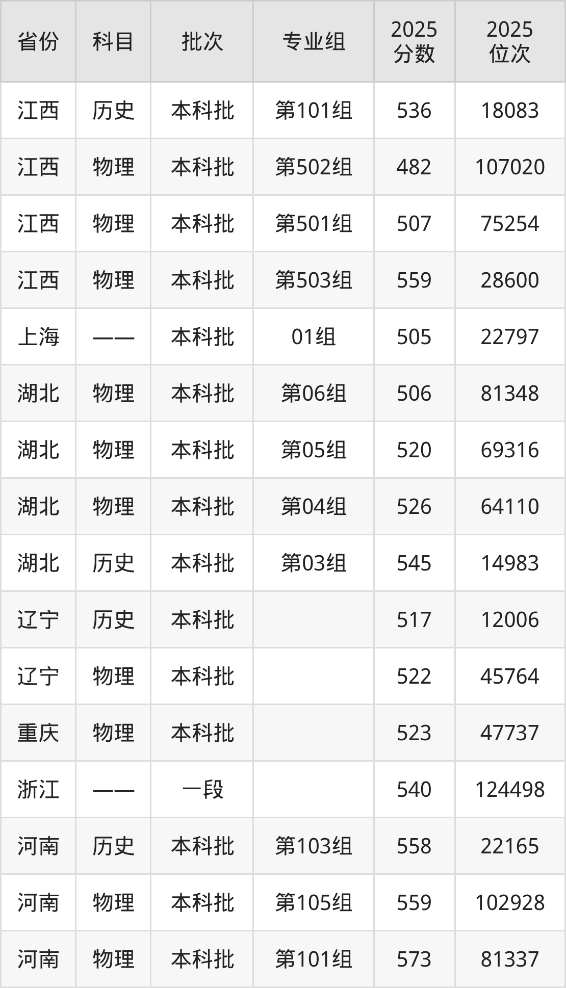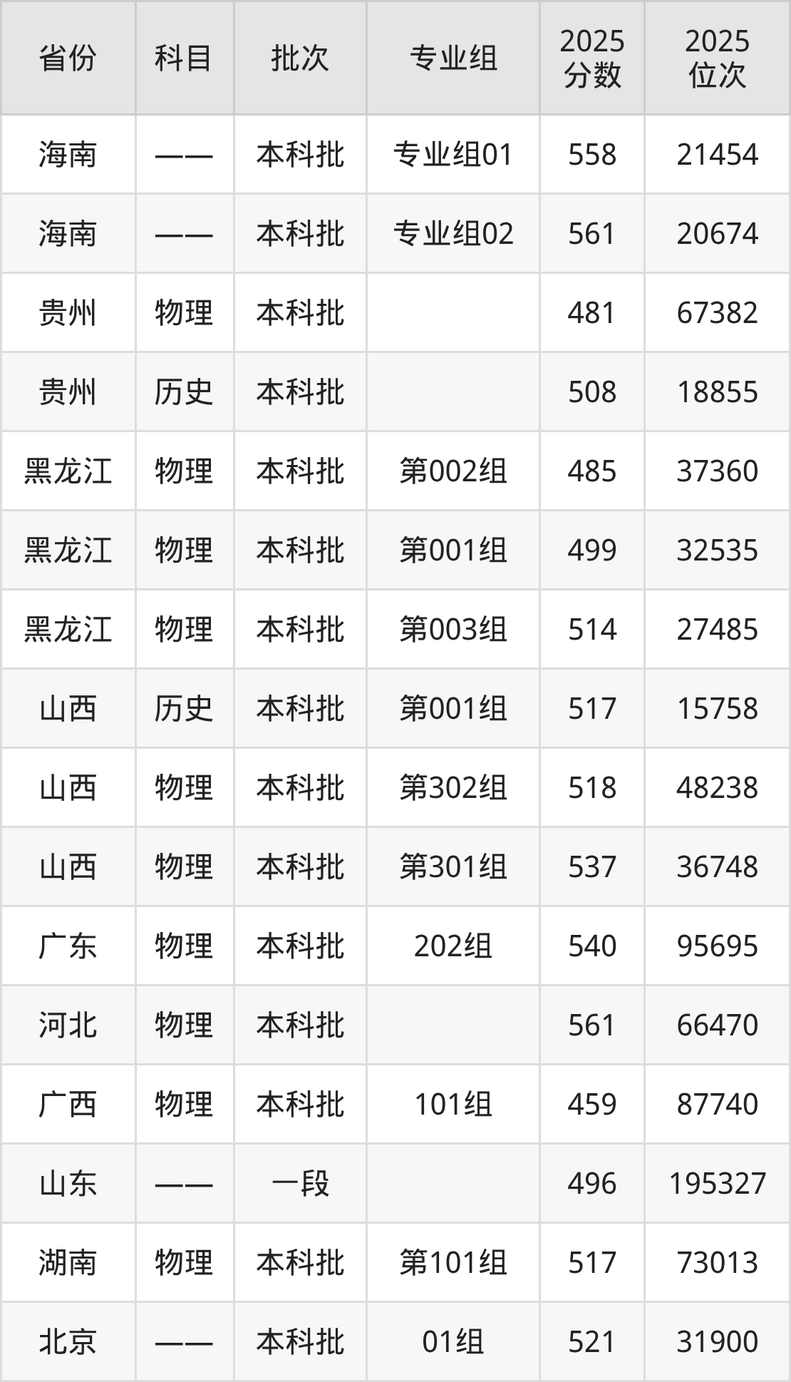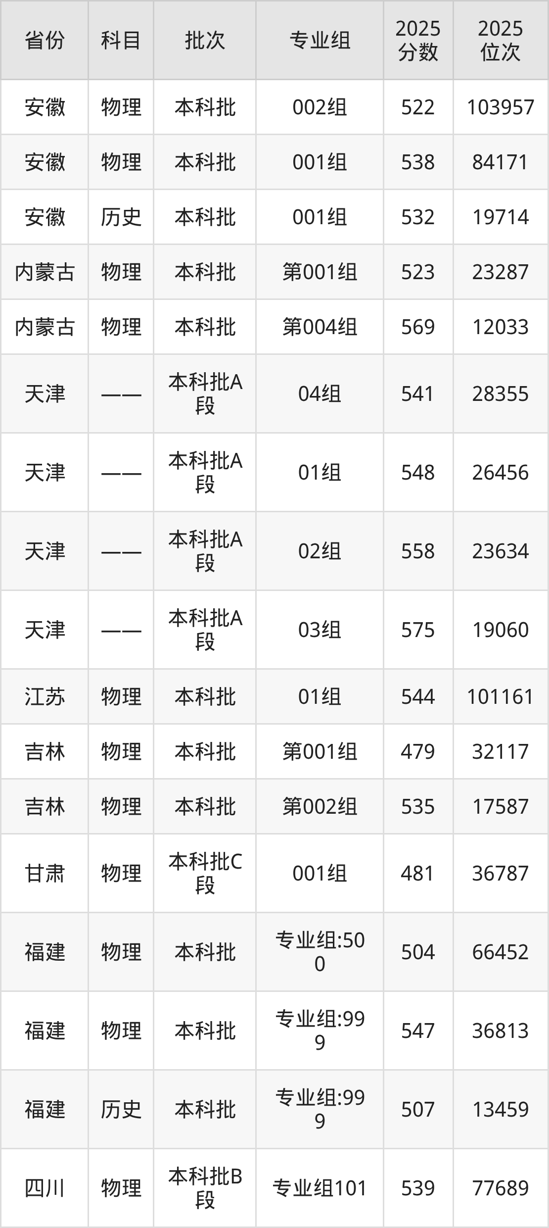 2025年在本科物理类进行招生,各专业组分数线详情如下: